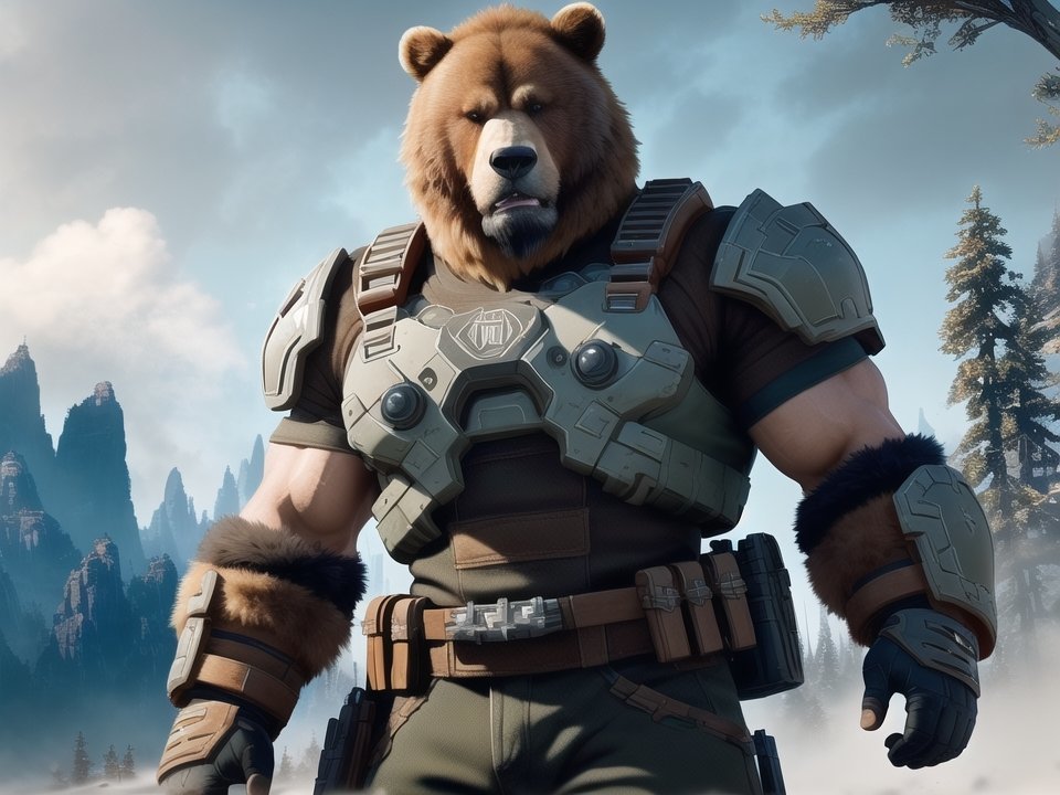 Mais bon ca reste une tête d'ours normal posé sur un corps humain, je sais pas trop comment lui donner un aspect différent, plus expressif, plus humain, anthropomorph semble pas trigger mais c'est peut être ça qui manque?