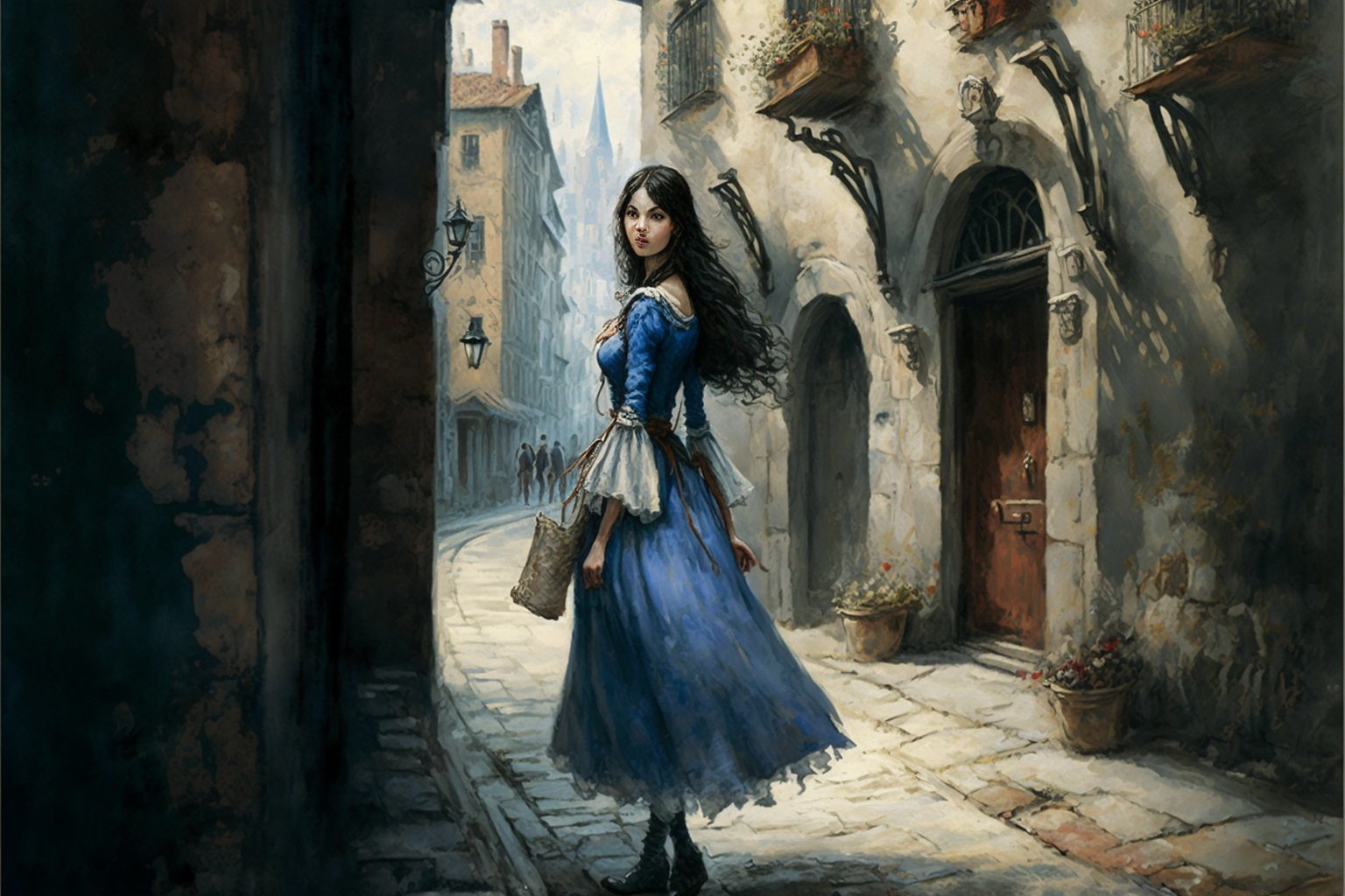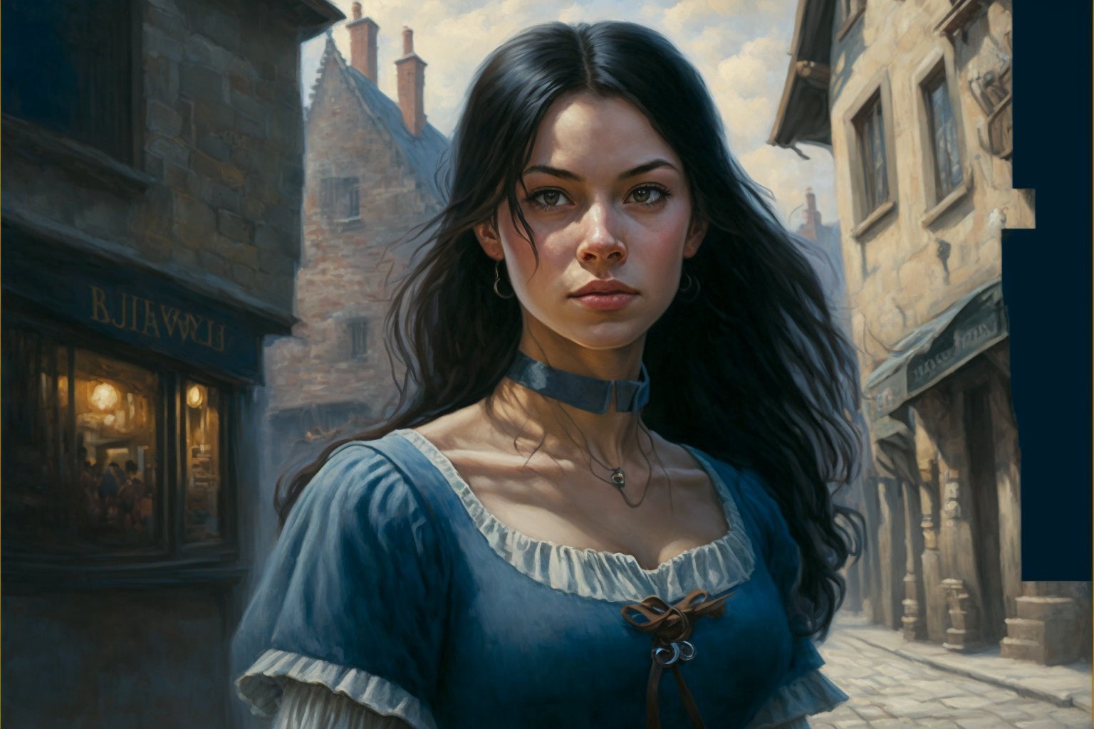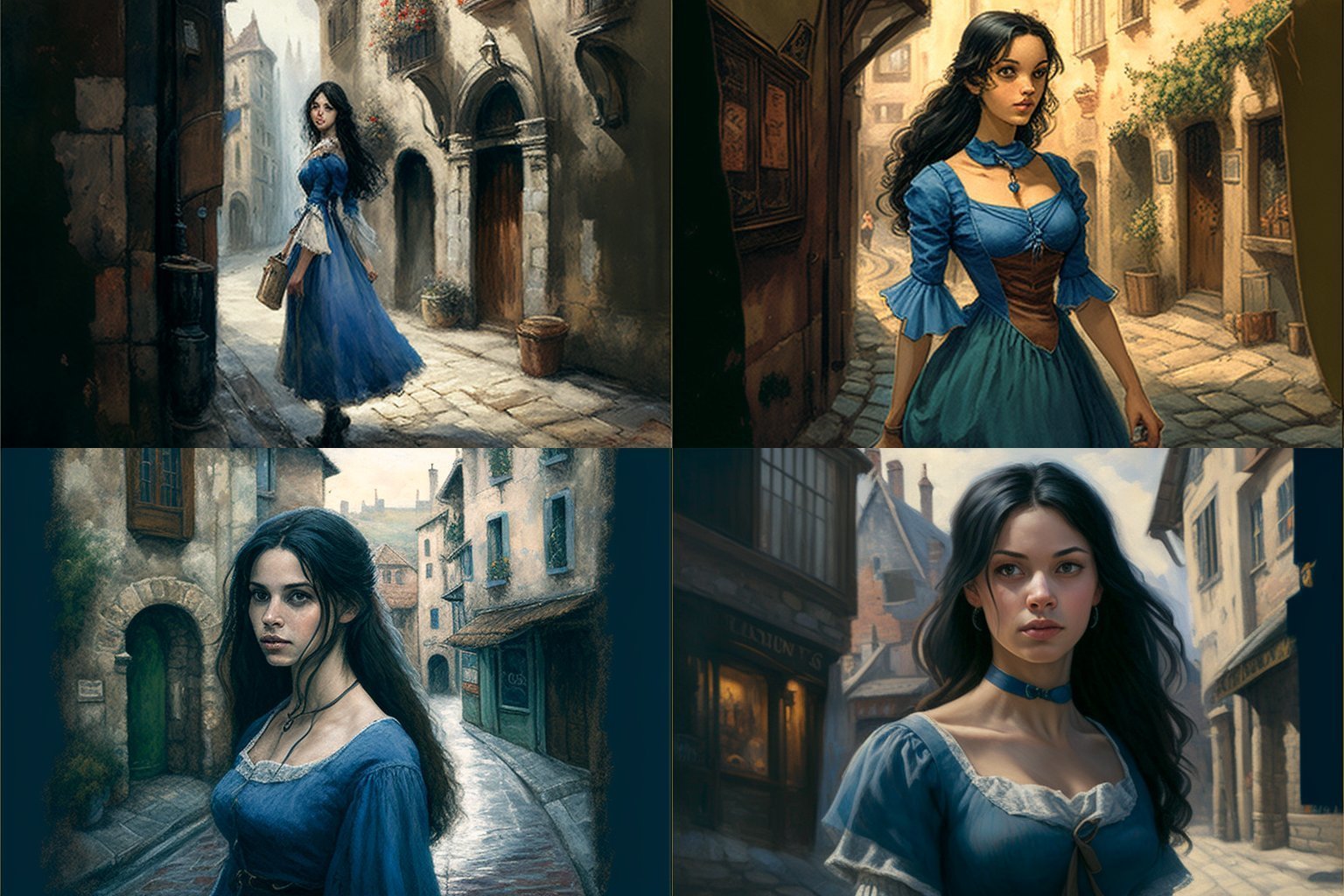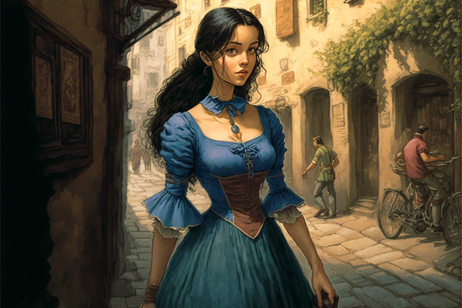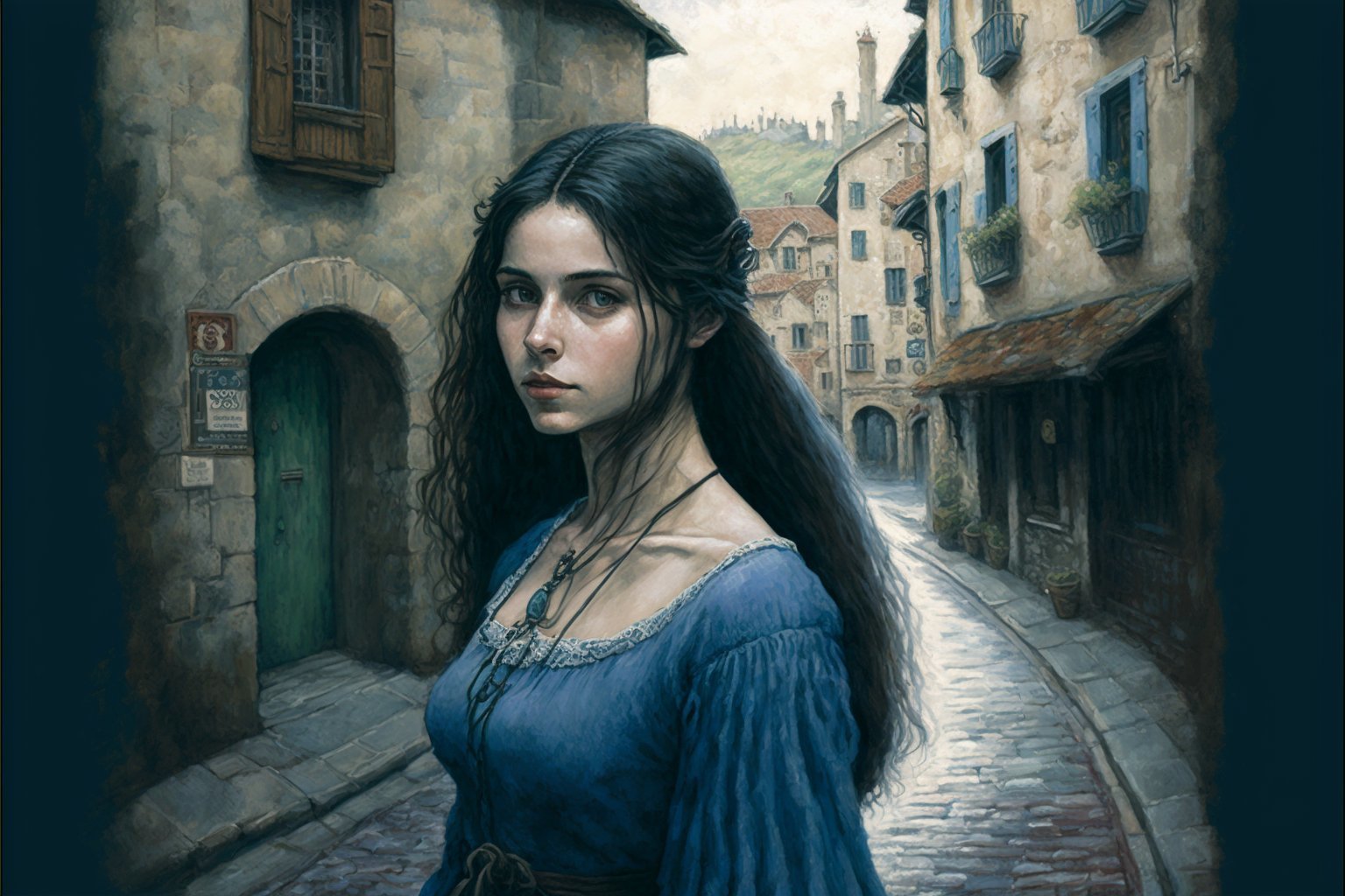 An evocative, atmospheric portrait of a young black-haired, blue-eyed woman in a short blue dress, walking in the streets of a medieval village. The subject exudes a sense of grace and confidence as she strides through the cobblestone streets, surrounded by the charming architecture and quaint shops of the village. The artist has captured the essence of the medieval era, with the subject's dress and hairstyle evoking the fashion of the time, and the village's architecture and atmosphere providing a rich and immersive background. The attention to detail is striking, from the texture of the subject's curly hair to the intricate patterns on her dress. The overall effect is one of nostalgia and romance, evoking a bygone era and the enchanting atmosphere of a medieval village.