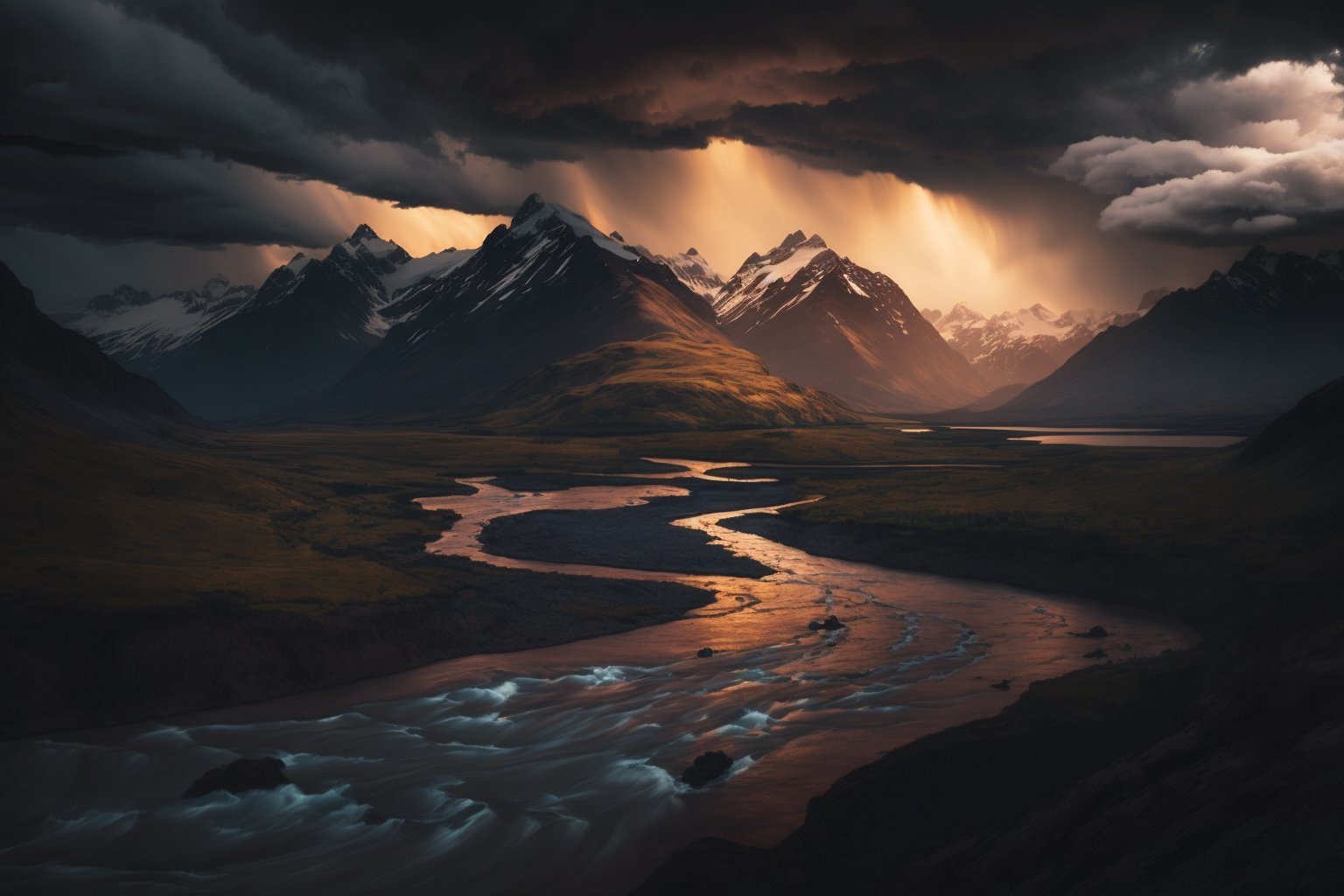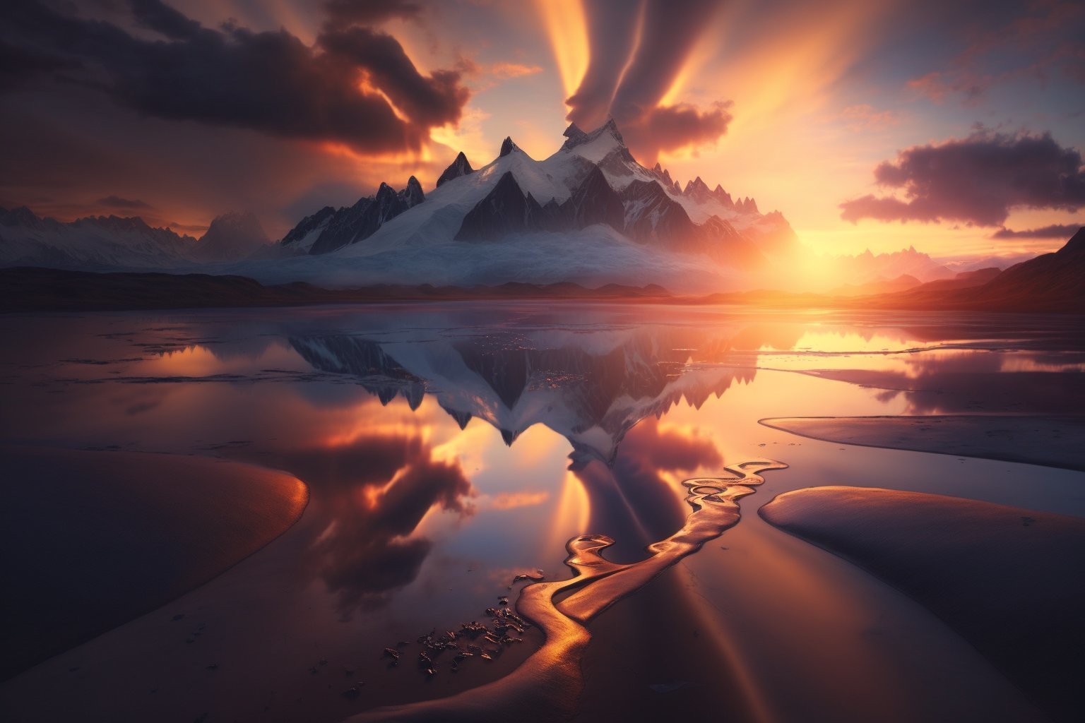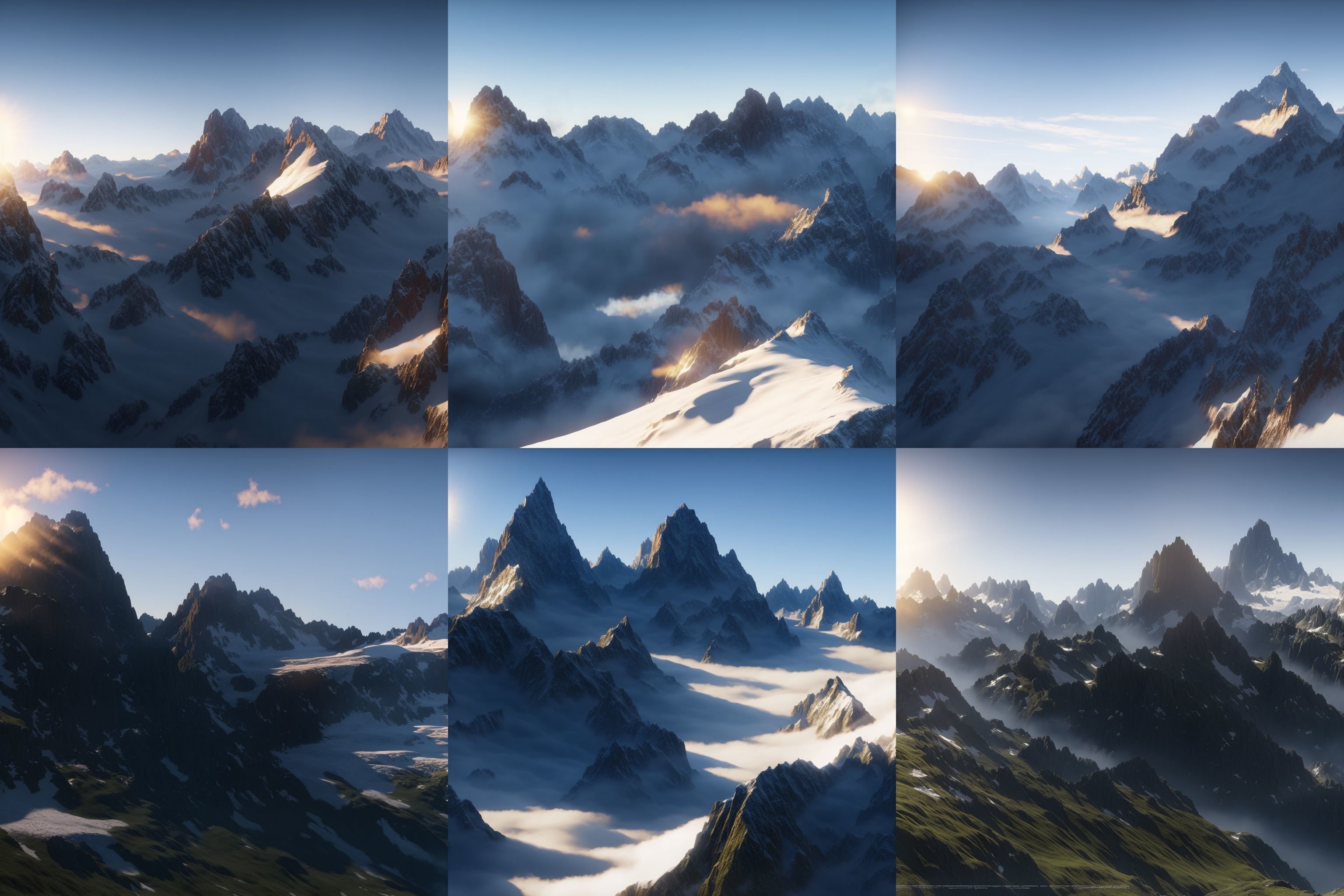 A Hyperrealistic photograph of mountains with snow, lens flares, cinematic, hdri, matte painting, concept art, celestial, soft render, highly detailed, cgsociety, octane render, trending on artstation, architectural HD, HQ, 4k, 8k, artstation landscape vista photography by Carr Clifton & Galen Rowell, 16K resolution, Landscape veduta photo by Dustin Lefevre & tdraw, detailed landscape painting by Ivan Shishkin, DeviantArt, Flickr, rendered in Enscape, Miyazaki