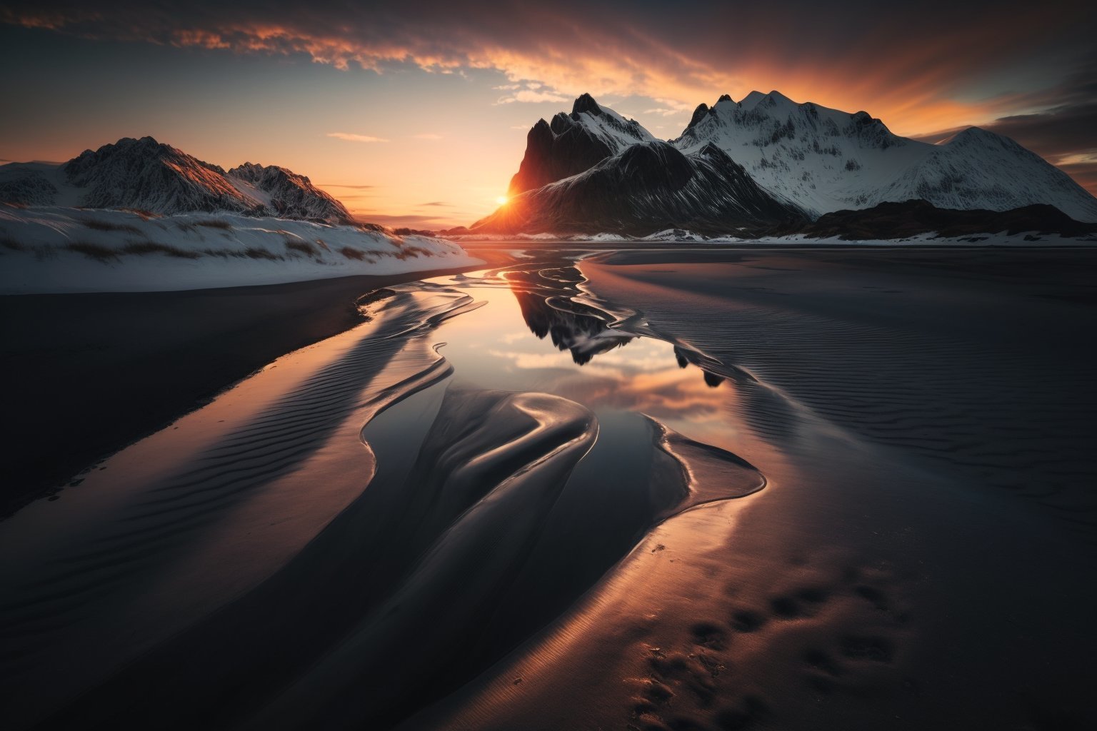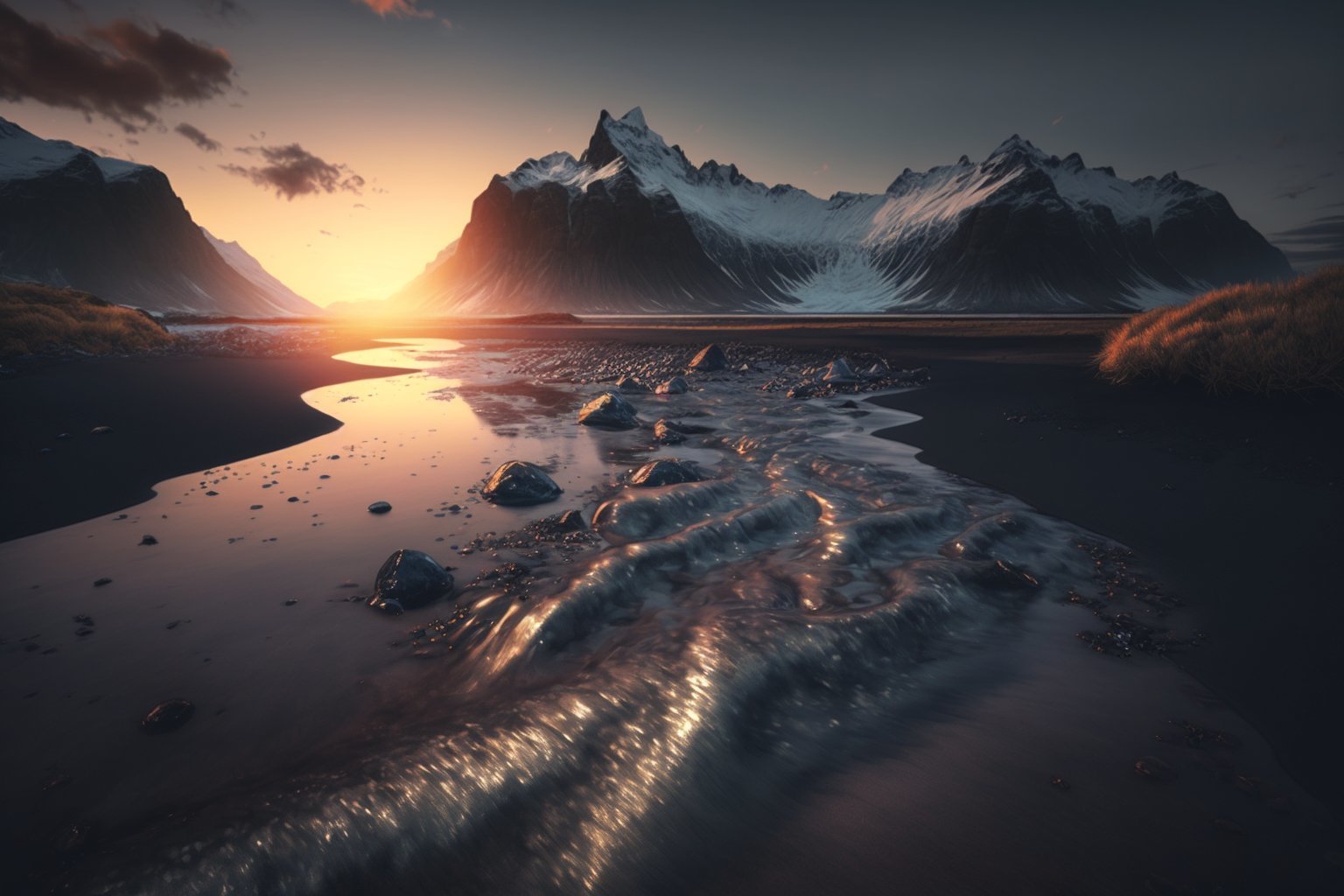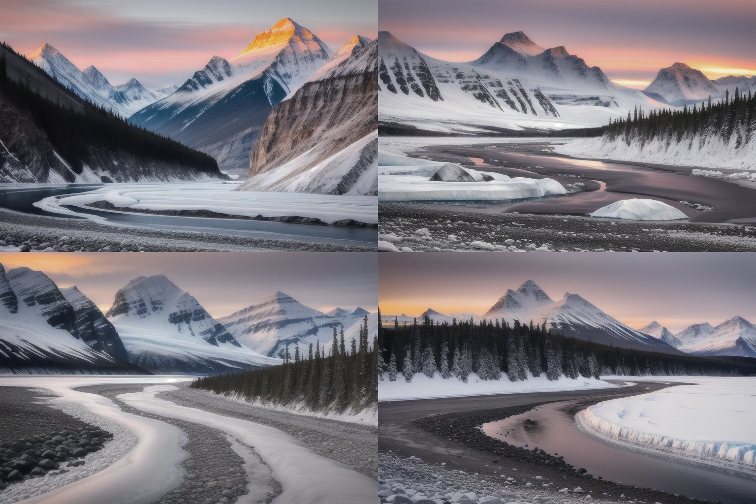 A Hyperrealistic photograph of mountains with snow, lens flares, cinematic, hdri, matte painting, concept art, celestial, soft render, highly detailed, cgsociety, octane render, trending on artstation, architectural HD, HQ, 4k, 8k, artstation landscape vista photography by Carr Clifton & Galen Rowell, 16K resolution, Landscape veduta photo by Dustin Lefevre & tdraw, detailed landscape painting by Ivan Shishkin, DeviantArt, Flickr, rendered in Enscape, Miyazaki