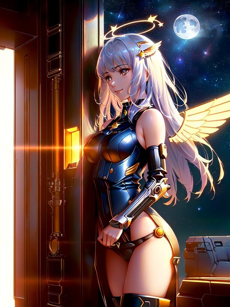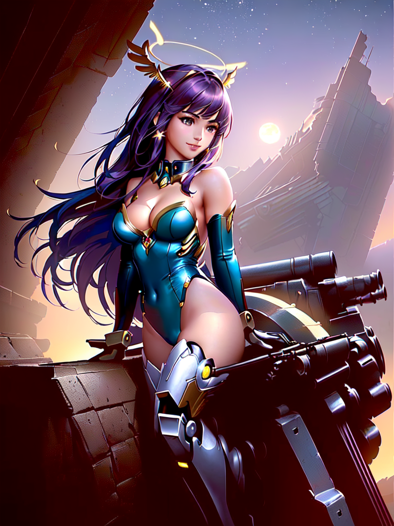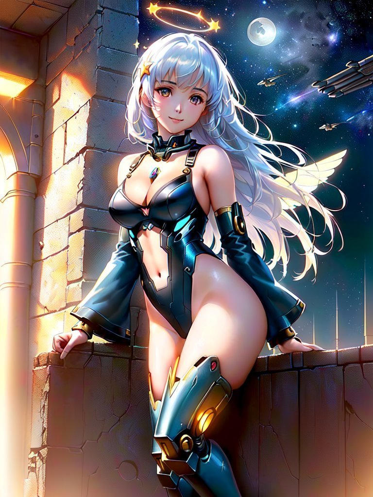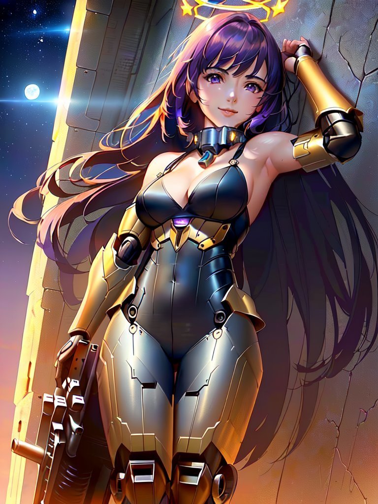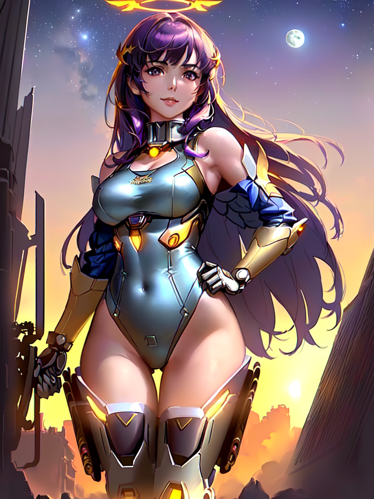 A fine illustration of a sexy mecha girl, solo, smiling at camera, mechanical arms, bare shoulders, mechanical collar, mechanical parts, mechanical legs, thigh boots, halo, mecha musume, purple hair, purple expressive eyes, very long hair, bodysuit, medium breasts, armpits, thighs, mechanical parts, wings, mechanical wings, hair ornament, star, moon, space, stars,