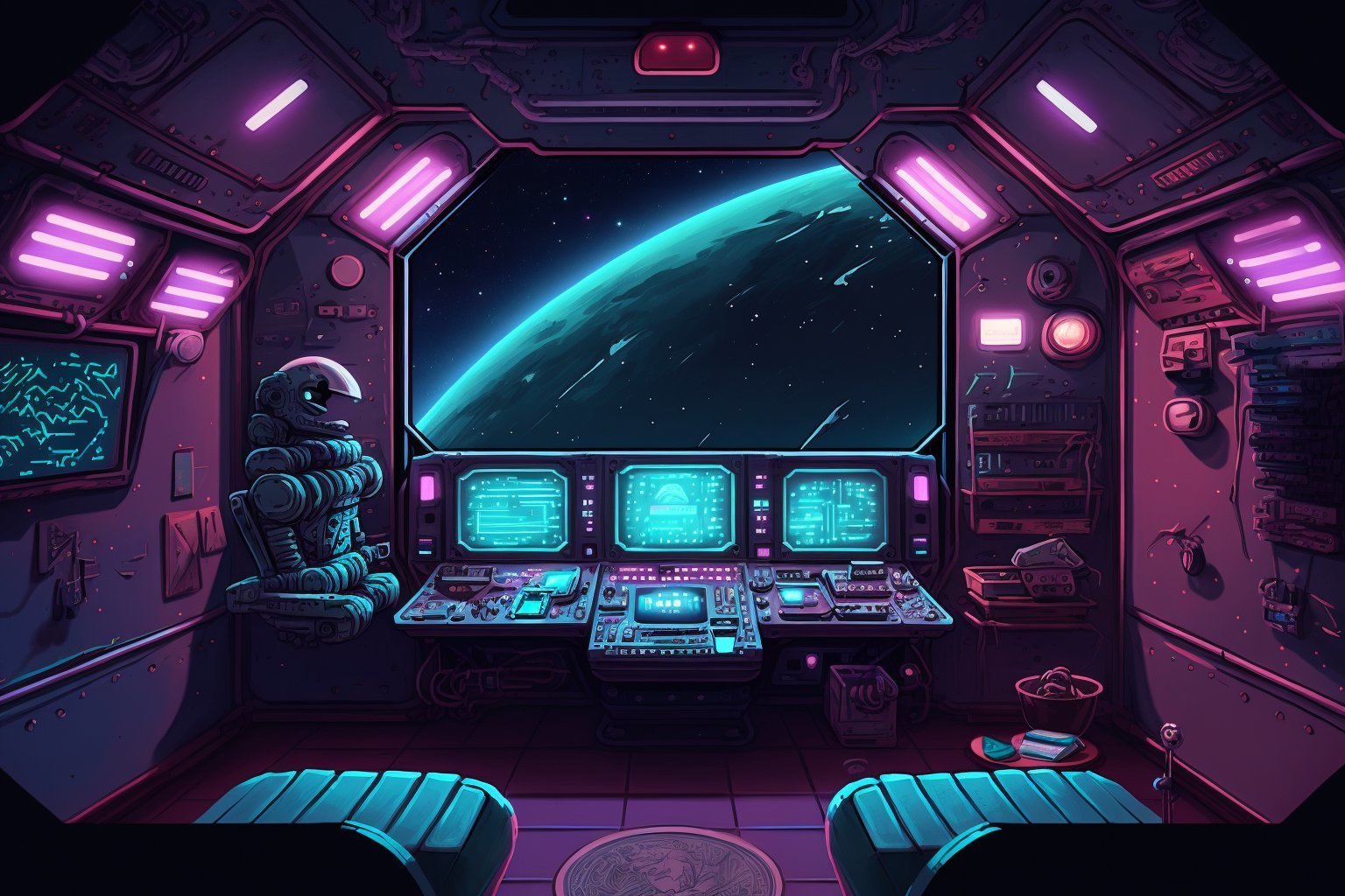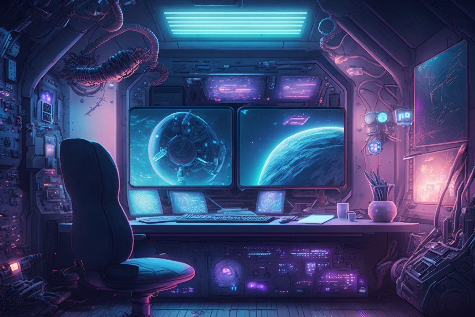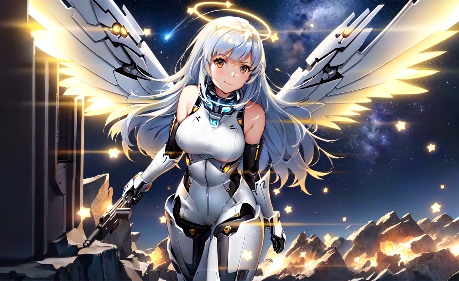 A fine illustration of a sexy mecha girl, solo, smiling at camera, mechanical arms, bare shoulders, mechanical collar, mechanical parts, mechanical legs, thigh boots, halo, mecha musume, purple hair, purple expressive eyes, very long hair, bodysuit, medium breasts, armpits, thighs, mechanical parts, wings, mechanical wings, hair ornament, star, moon, space, stars,