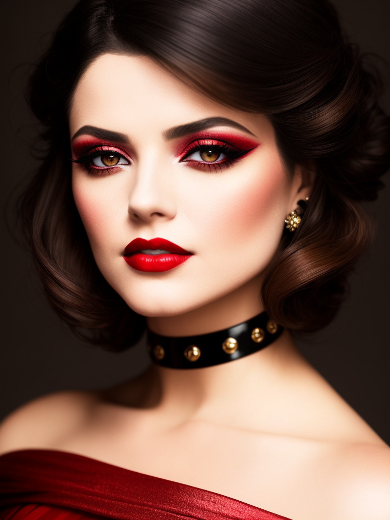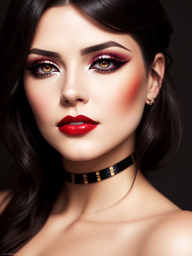 Prompt : Close up portrait of a woman with a dramatic makeup, (smoky eyes, red lips), realistic, highly detailed, harsh lighting, cinematic lighting, art by artgerm and greg rutkowski and alphonse mucha, (glamour, allure, seduction) hasselblad, 45 degree, hard light, gigapixel