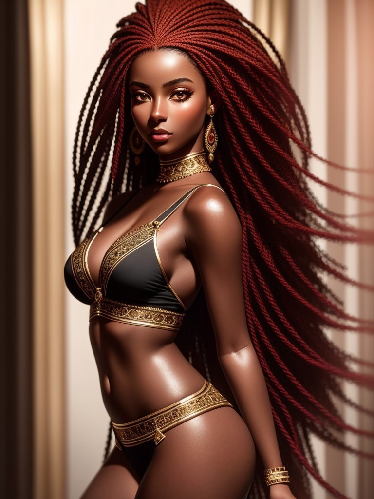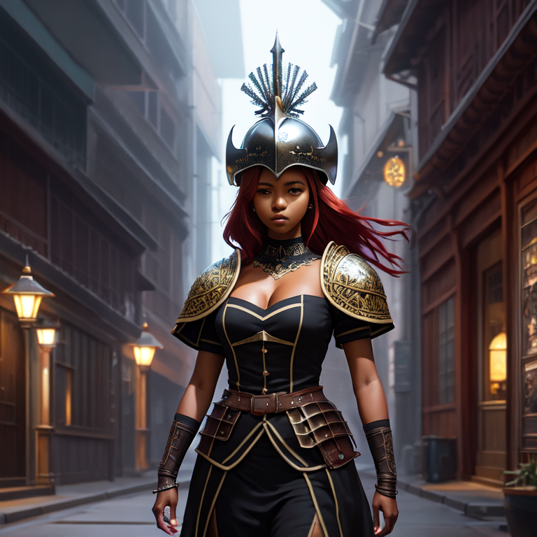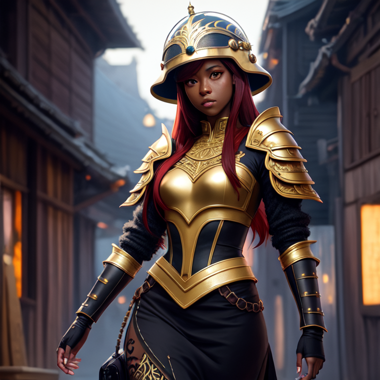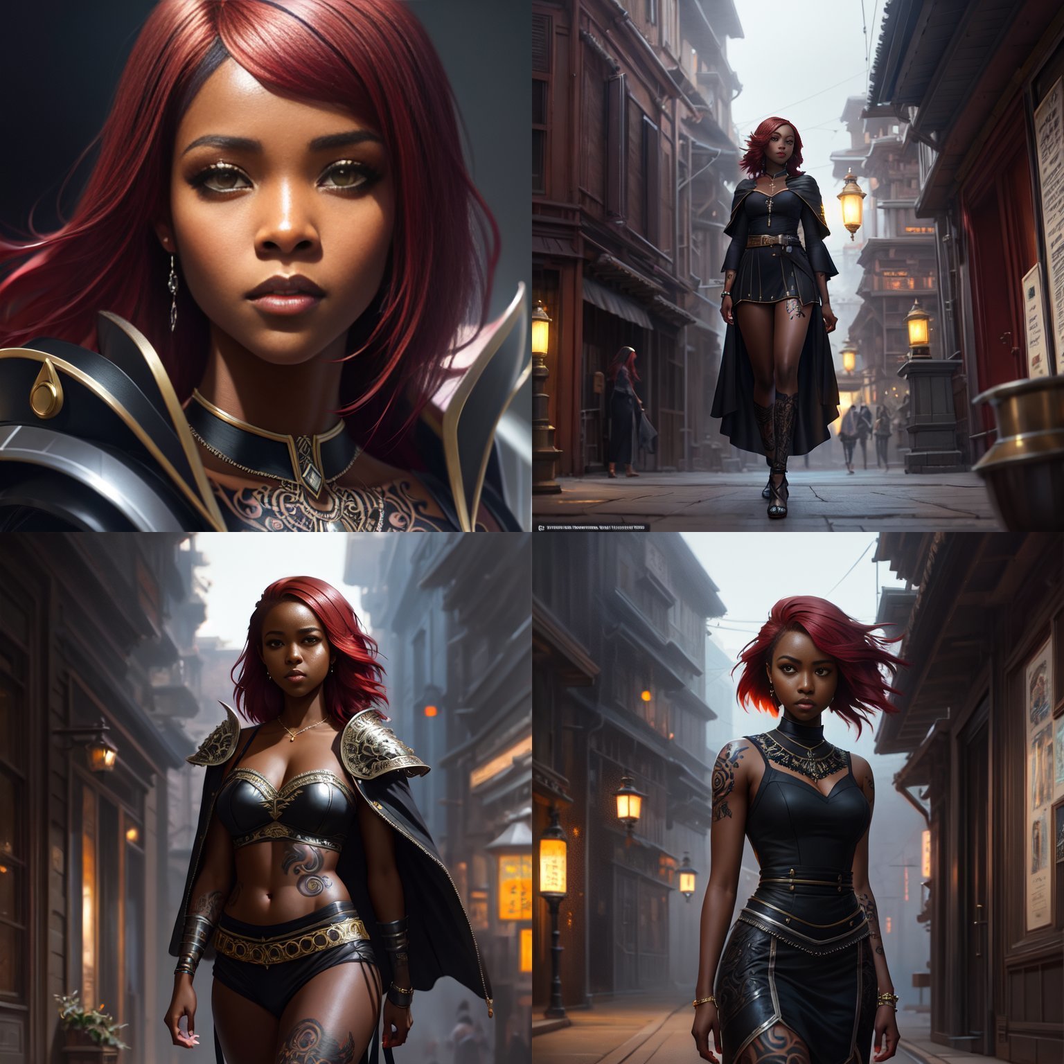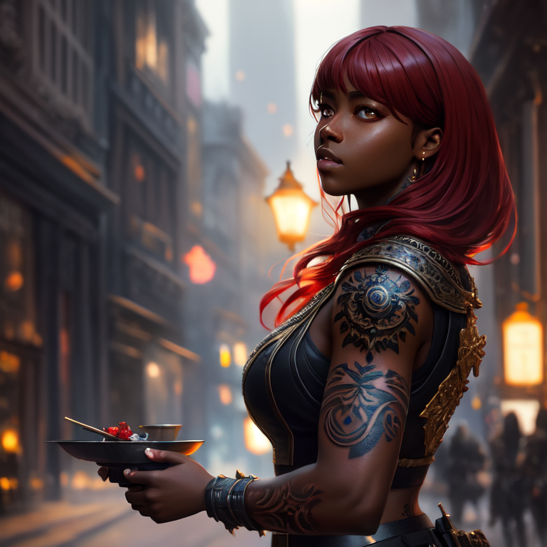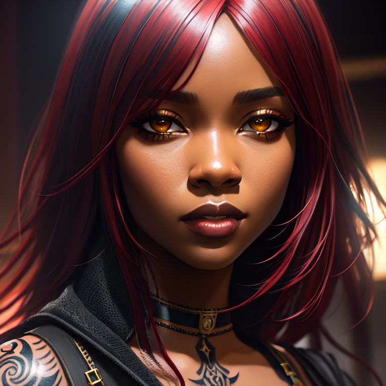 Prompt : (((red hair)))+, (((black female)))+, silver armor, (((dark skin)))+, (((black girl)))+, (((ebony)))+,(((black tattoo))), (((black face)))+, (((black)))+, full body, symetric tattoo, red eye, modelshoot style, (extremely detailed CG unity 8k wallpaper), cinematic style shot photo of the most beautiful artwork in the world, photorealistic by Ed Blinkey, Atey Ghailan, Studio Ghibli, by Jeremy Mann, Greg Manchess, Antonio Moro, Charlie Bowater, John william waterhouse, trending on ArtStation, trending on CGSociety, Intricate, High Detail, Sharp focus, dramatic, photorealistic art by midjourney and greg rutkowski, masterpiece, magnificient, extremely detailed photo, very high resolution, intricate detailed, detailed intricate environment, extremely detailed objects, high resolution, sharp focus, precisionism, ambient occlusion, subsurface scattering, octane render, cinematic light, volumetric lighting, Megapixel Cinematic Lighting, high quality shadows, Anti-Aliasing, FKAA, TXAA, RTX, SSAO, HDR, Post Processing, Post-Production, Tone Mapping, CGI, VFX, SFX