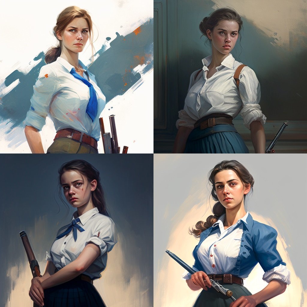 Salut! Est-ce que l'un d'entre vous peut me générer une jeune fille adulte, sans trop de poitrine, qui porte une jupe d'écolière bleu marine, une chemise blanche et qui tient un fusil?![]()