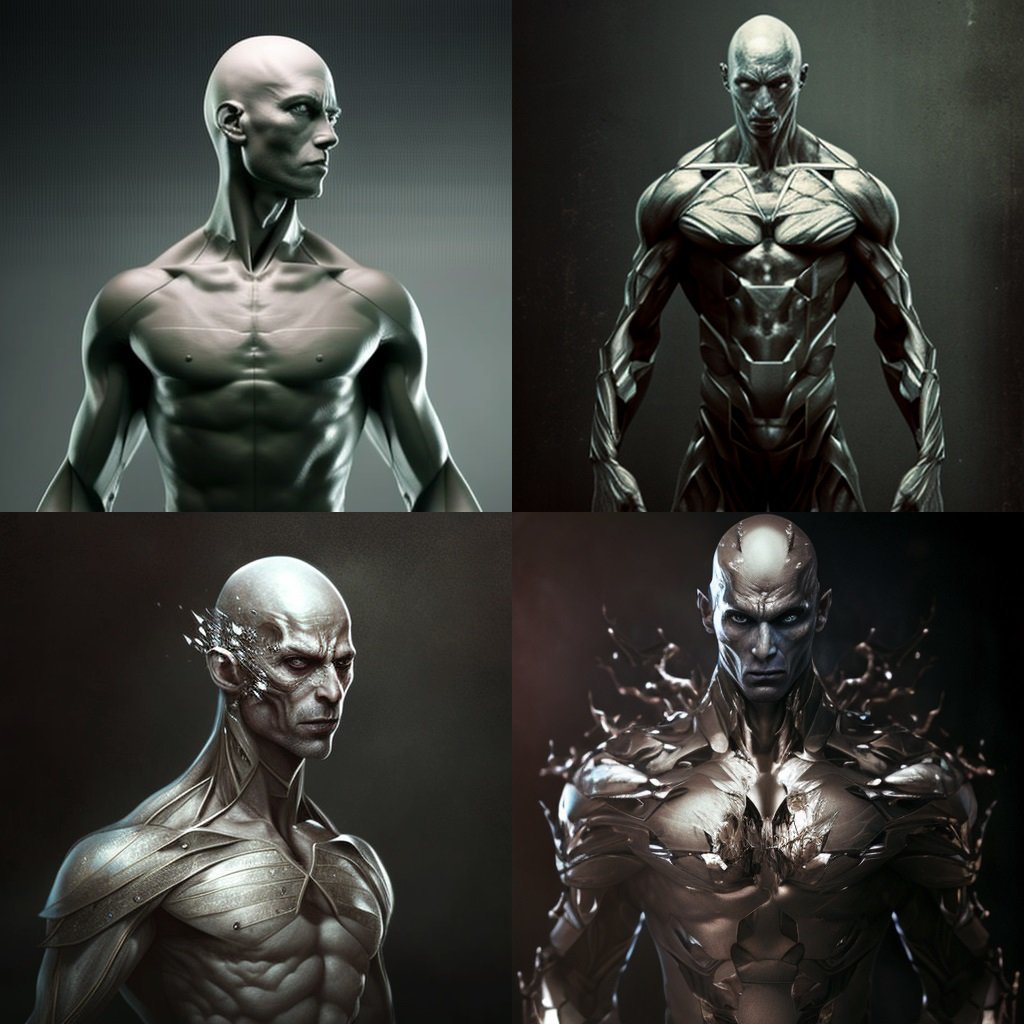 J'ai une demande, est-ce que c'est possible que quelqu'un fabrique cette image :- Un homme grand à la peau grise métallique, chauve, et qui a des têtes à la place des mains et des pieds ?