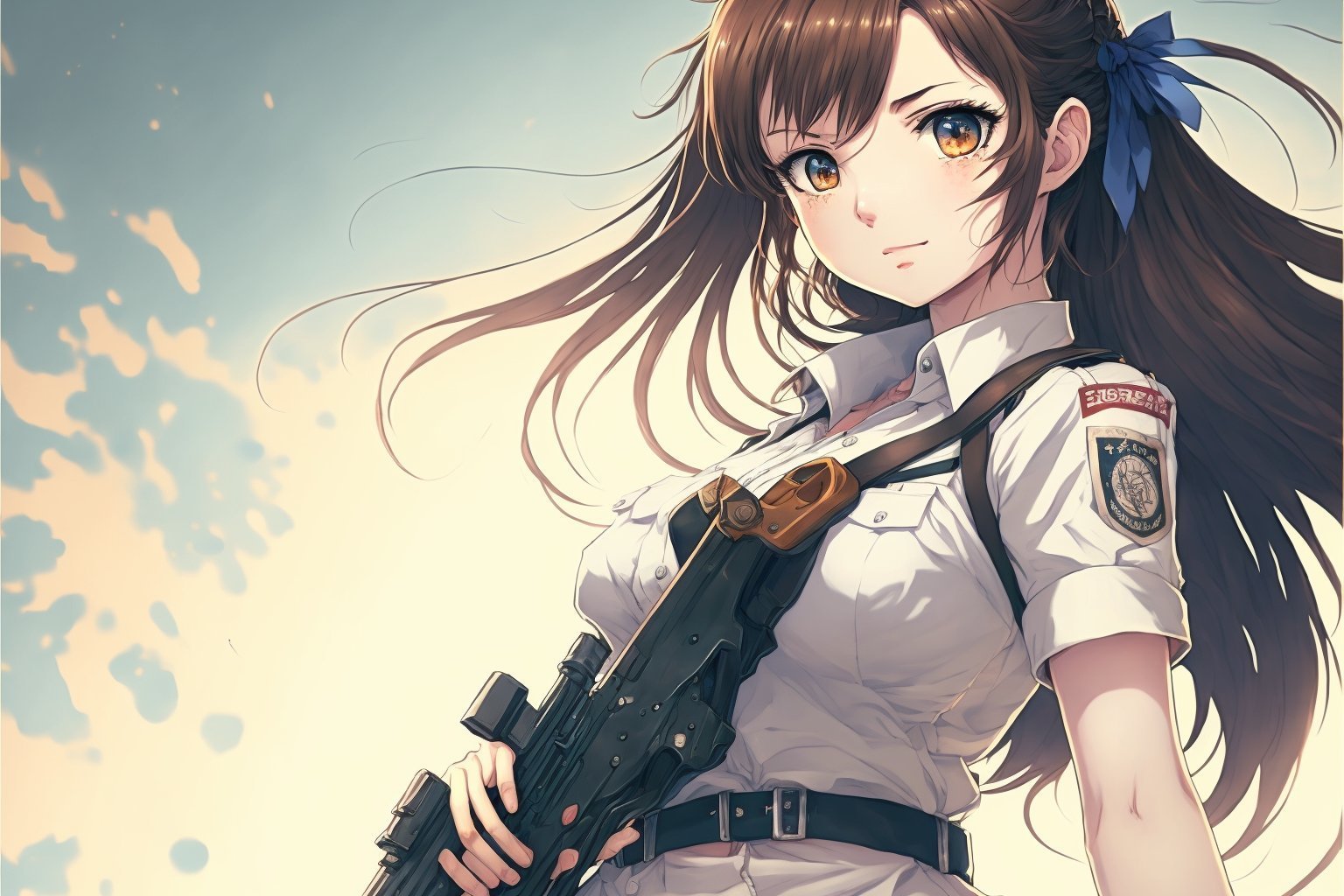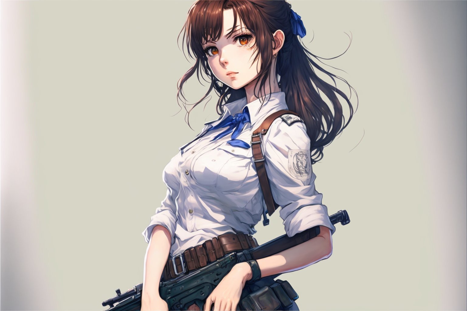 Salut! Est-ce que l'un d'entre vous peut me générer une jeune fille adulte, sans trop de poitrine, qui porte une jupe d'écolière bleu marine, une chemise blanche et qui tient un fusil?![]()