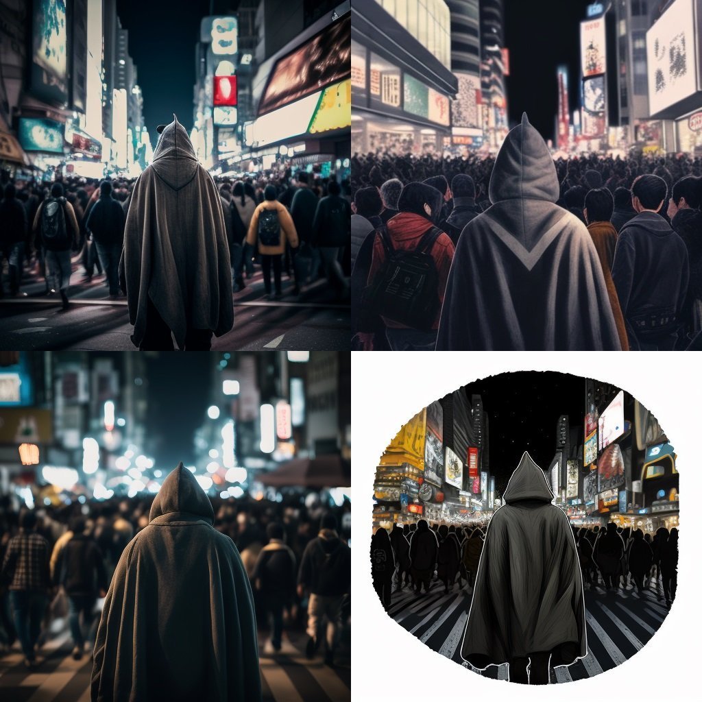 Demande un peu bizarre, mais l'idée m'inspireEn français: Loup gris bipède de taille humaine portante une capuche et une cape marchant au milieu du passage de shibuya bondé en pleine nuit