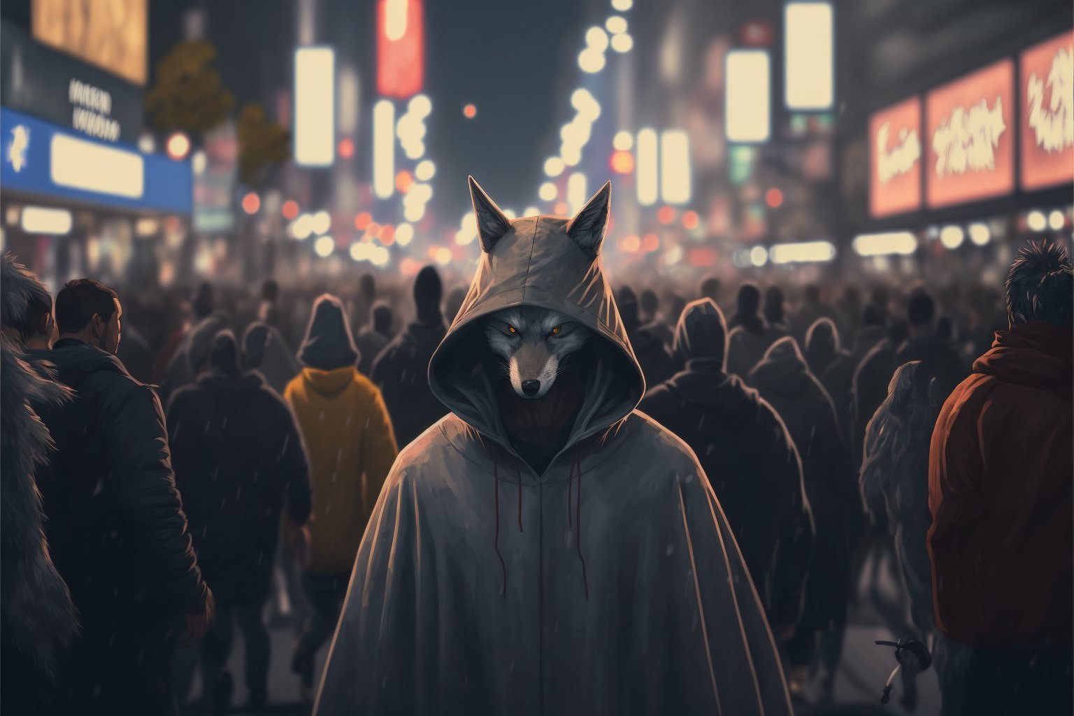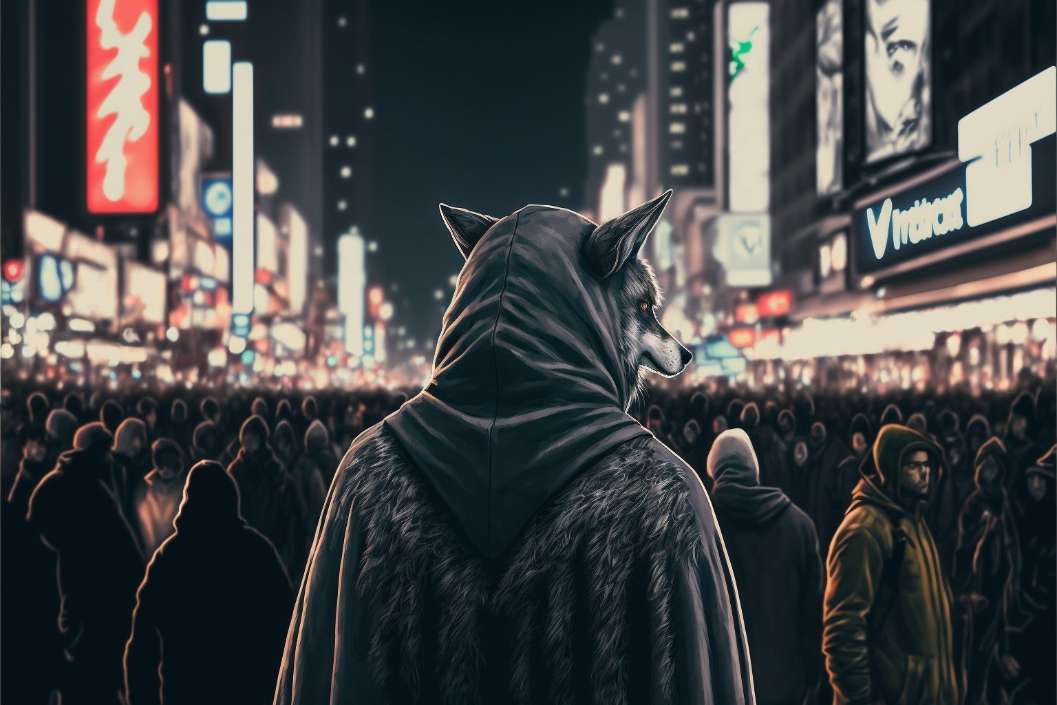En anglais: Bipedal grey wolf of human size wearing a hood and a cape walking in the middle of the crowded shibuya crossing at night
