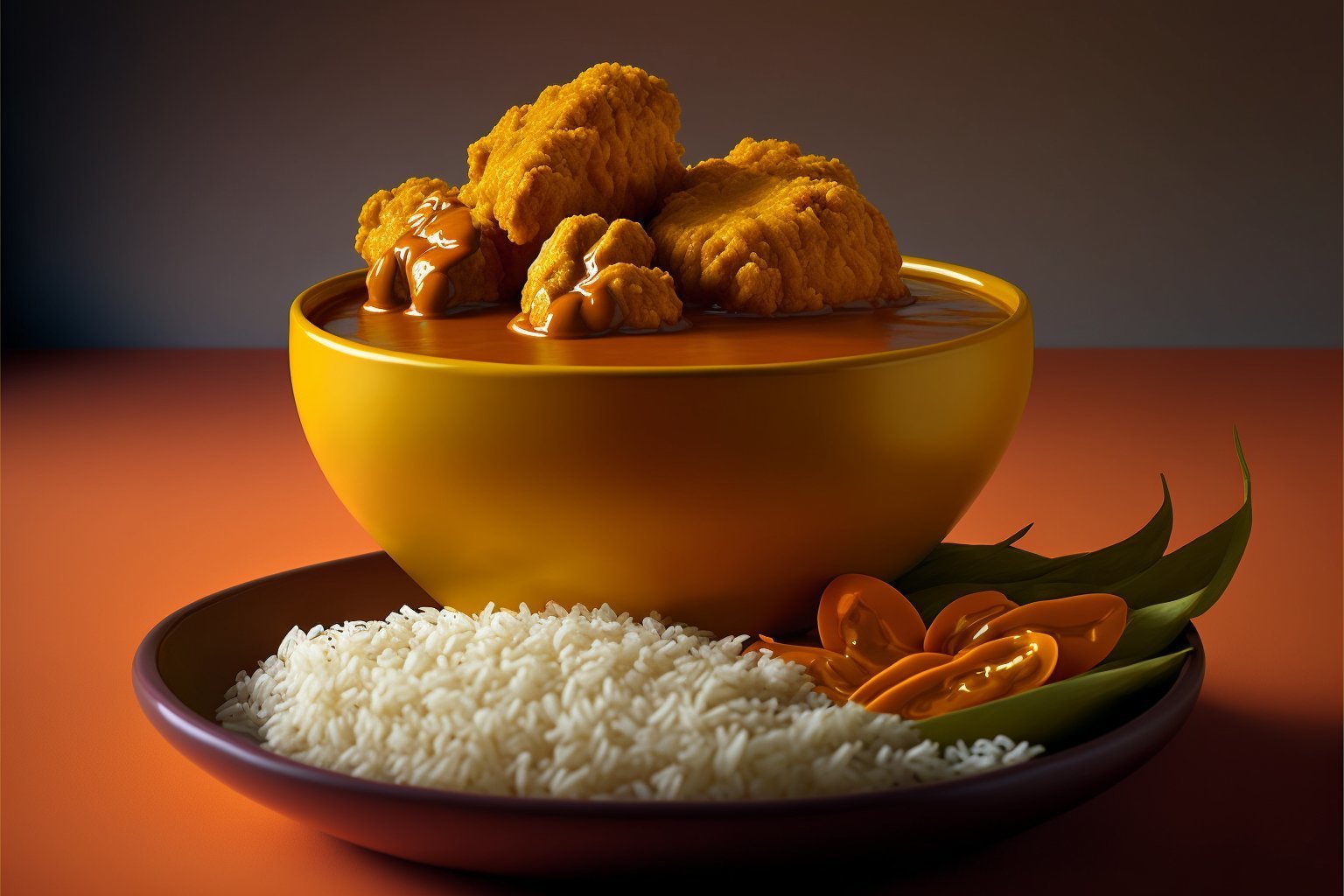 > Est-ce que quelqu'un peut me faire en style réaliste un plat de riz dans un bol vert, avec de la sauce curry épaisse et beaucoup de nuggets de poulet frit?