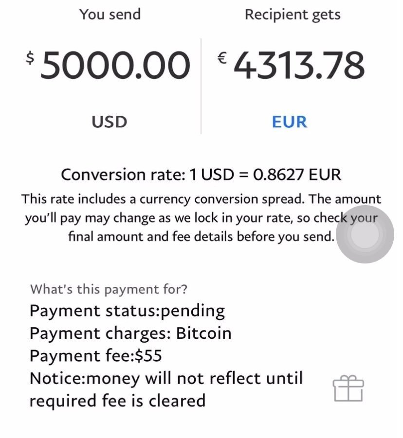 Si la personne m’envoie ça Et me dit que pour recevoir le payement faut que je règle les « payment charges » en bitcoins comme marqué en bas de la capture d’écran, et que les « payement fee » sont de 55 balles de bitcoin c’est un scam ?