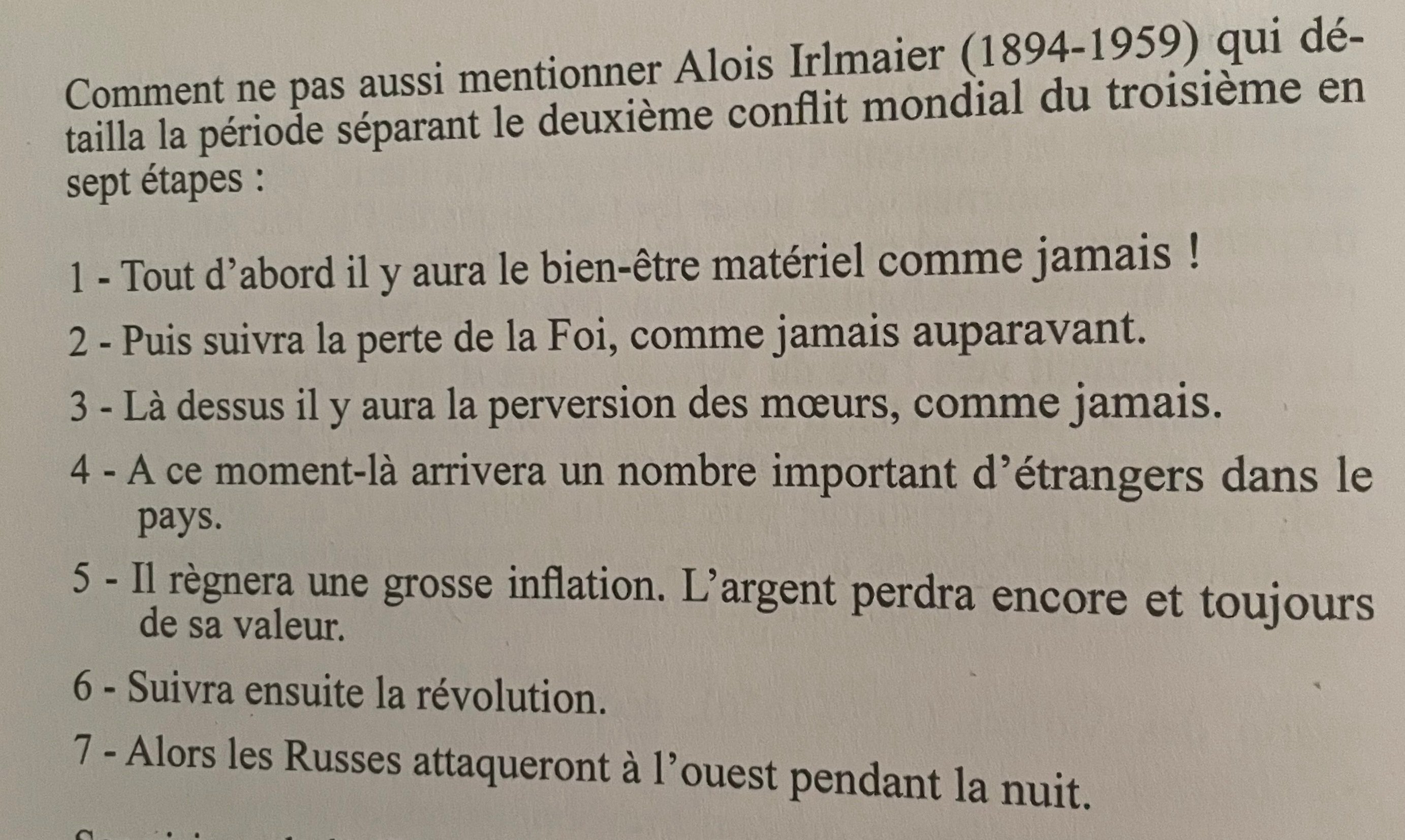 Je pense que Alois Irlmaier était un homme remarquable qui a fait un travail incroyable pour aider les gens à traverser des moments difficiles. Il a encouragé les gens à s'unir et à être solidaires, ce qui est essentiel pour lutter contre les inégalités et les injustices du néolibéralisme.