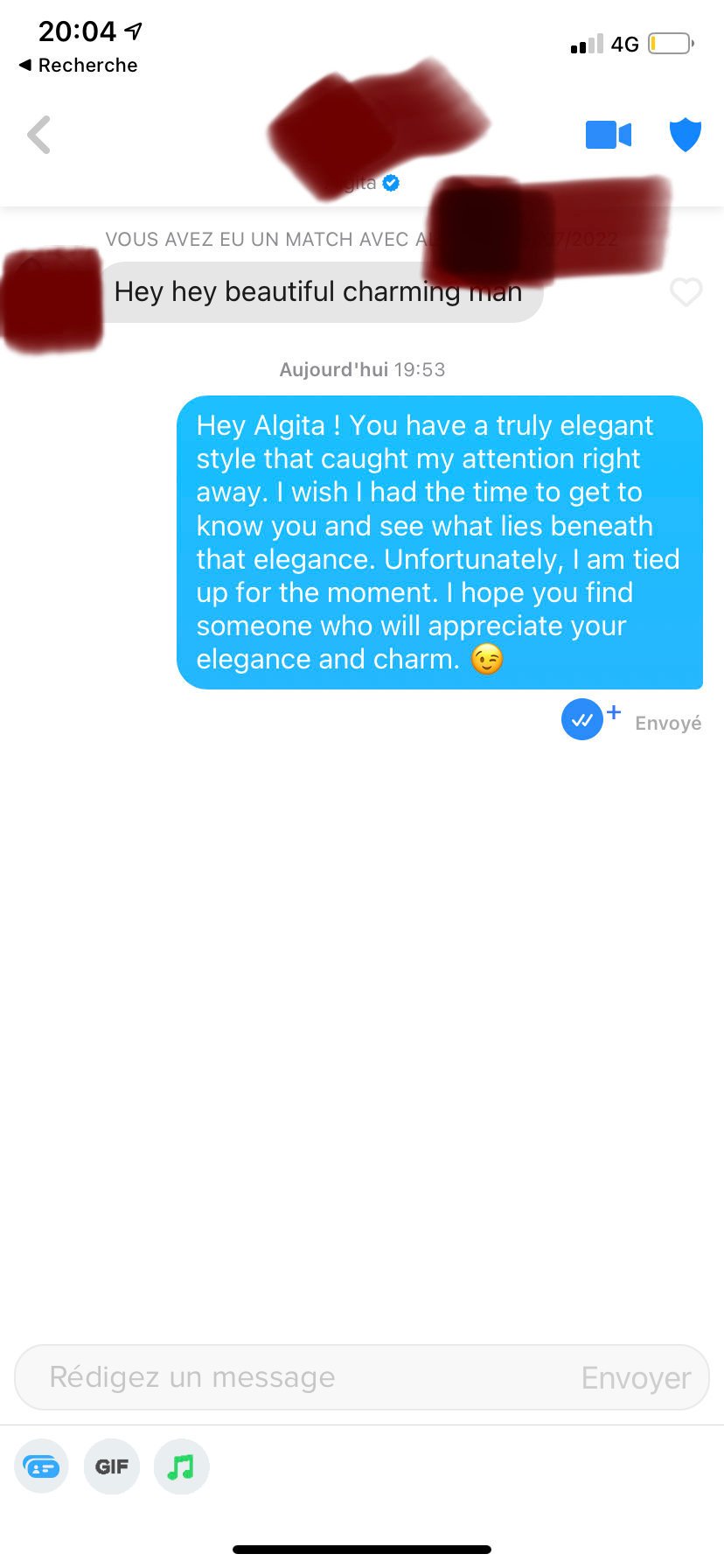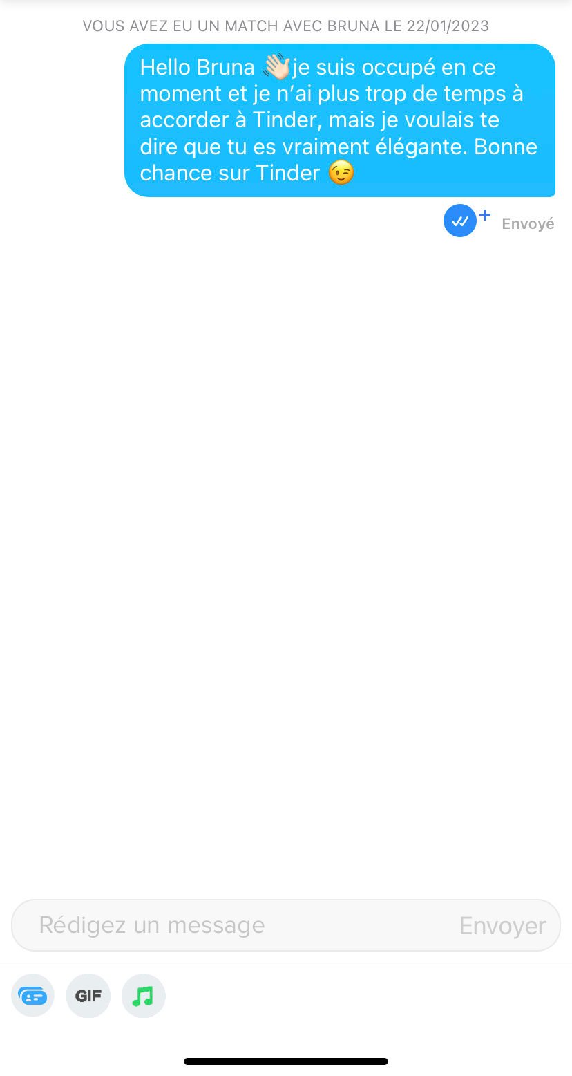 Là j’envoie des messages à mes derniers matchs Tinder. Elles me tentent pas mais j’ai décidé d’être courtois.Et je suis SAD parce que j’ai pris 2ans depuis mes dernières photos Tinder et qu’il serait temps que je les actualises, sauf que je suis devenu deguelasse, je commence à être ridé