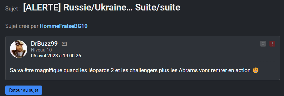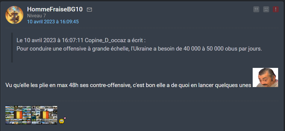 Le 25 janvier 2023 à 19:43:57 :la guerre va encore durer 10 ans et ça s'arrêtera quand un des 2 camps n'aura plus de ressources