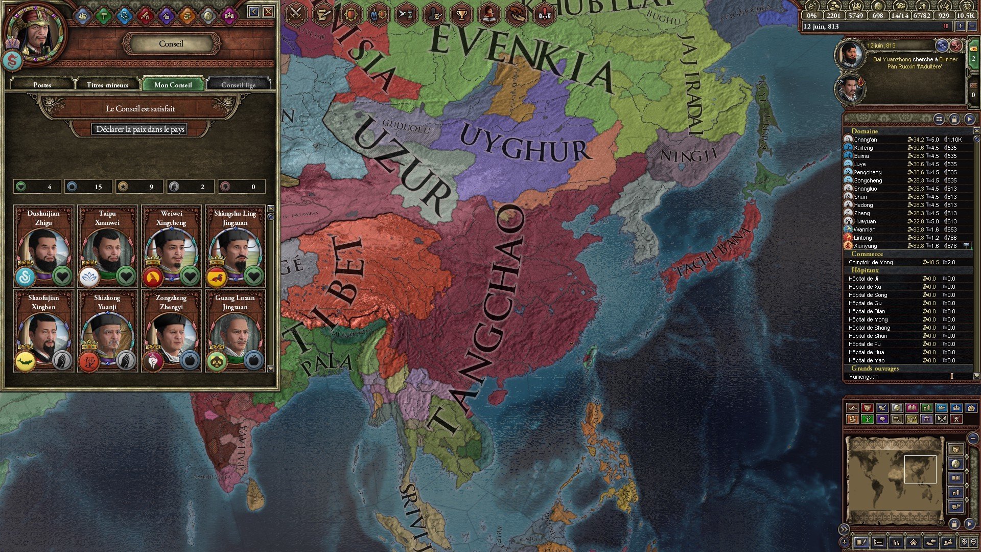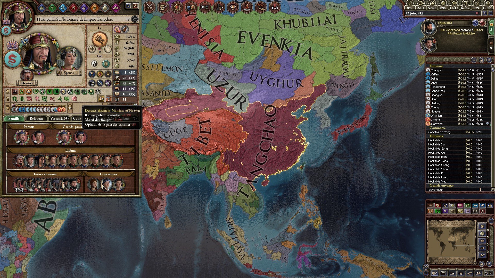 Quels sont les problèmes pouvant réduire le mandat céleste ? La maladie ( et tu as toujours des épidémies dans le jeu ) ; une guerre civile ou être en déficit monétaire ( avoir -1 ducat ou plus dans tes coffres ) et si tu cumules les 3, tu as 3 fois le malus de la perte du mandat céleste ( donc je vous laisse deviner l'état de la Chine quand l'Empereur a -99 de relation avec ses vassaux )