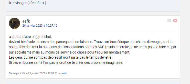 Moi ce qui m’agace c’est le nombre hallucinant de tous les simps qui veulent une seule chose, son cul. Ca se cache derrière des phrases compatissantes, mais ça cherche une chose.Assurer votre descendance avec une kheyette instable, et qui se contredit constamment ne vous fera en rien plus de bien, votre vie restera aussi pathétique qu’à l’accoutumée, essayer d’avoir l’attention des filles de ce forum vous réduira en lambeaux de chair
