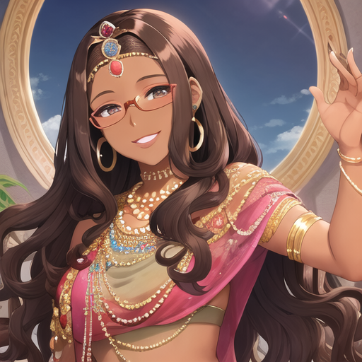 seins inversés, levres pulpeuses, peau noisette, yeux clairs, diademe, cheveux bouclés, ongles fins et longs, lunettes rondes, boucles d'oreilles, rouge à lèvres violetelle est pas mal mais elle n'a pas la peau noire
