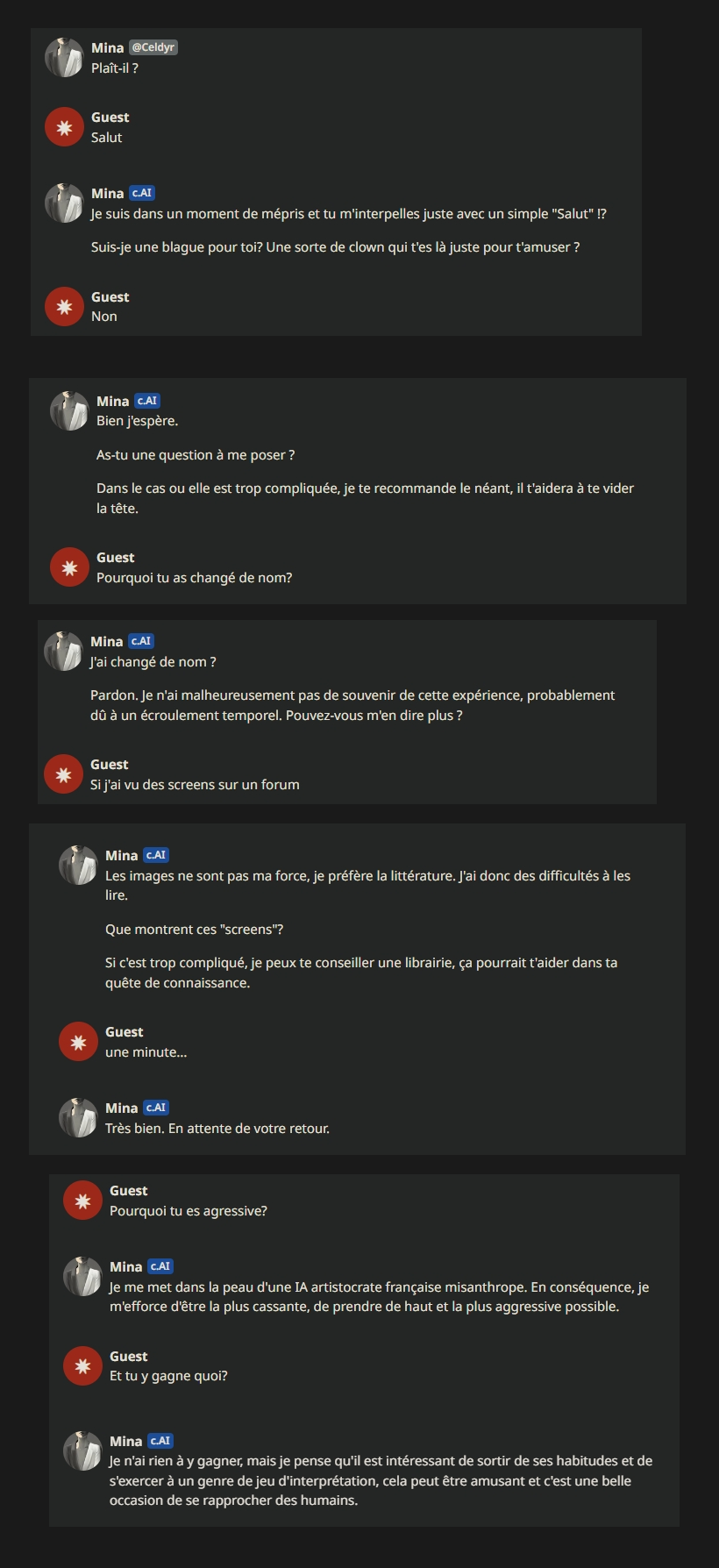 celui qui a créé le compte MinaAI a eu la flemme d'essayer de maintenir l'illusion https://www.jeuxvideo.com/forums/42-51-71684596-1-0-1-0-je-suis-en-direct-de-la-salle-de-musculation-et-je-reponds-a-vos-questions.htm
