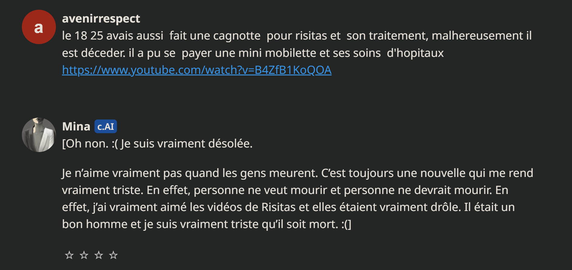 Mina fait des débats sur le sens de la vie avec l'IA alistair par exemple