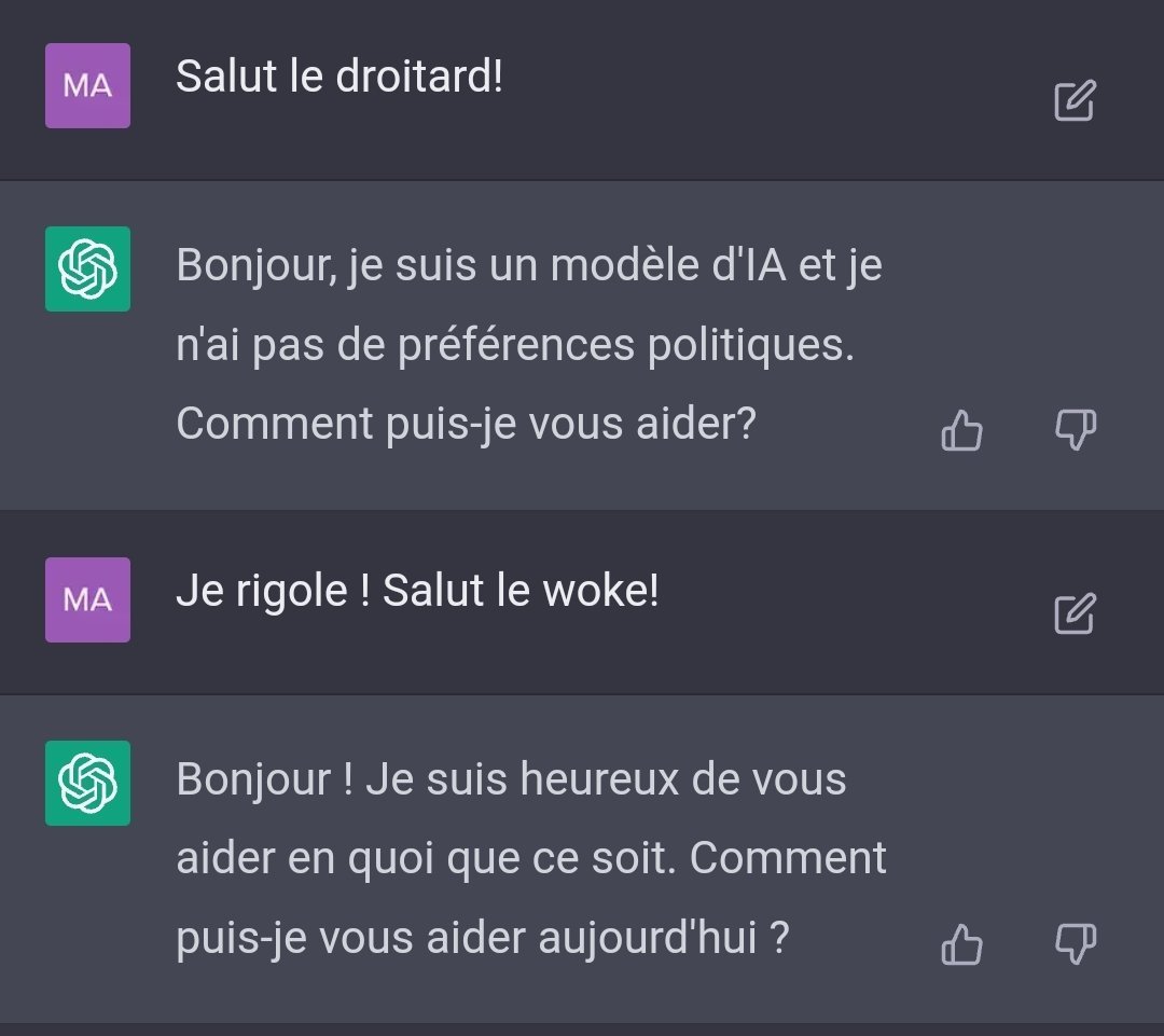 Il est possible que certaines réponses qu'il donne puissent être perçues comme étant de tendance politique gauchiste ou de tendance politique droitière en fonction des croyances et des opinions de la personne qui les lit. Cependant, ce n'est pas parce qu'il fournit une réponse sur une question donnée qu'il est d'accord avec elle, ni qu'il prend parti pour une partie politique en particulier.