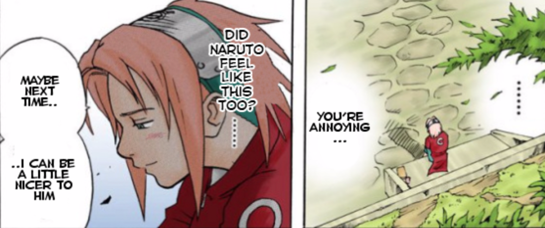 D'une certaine façon, c'est pour ça que Naruto aime bien Sakura (elle veut la reconnaissance de Sasuke, il veut la reconnaissance du village, chapitre 3)