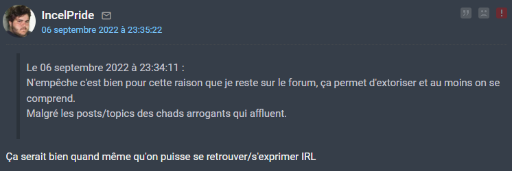 Faire un pavé car tu n'arrives pas à baiser c'est vraiment inquiétant kheyC'est pas que je n'arrive pas,c'est que je ne plais pas+j'ai été violemment redpill.