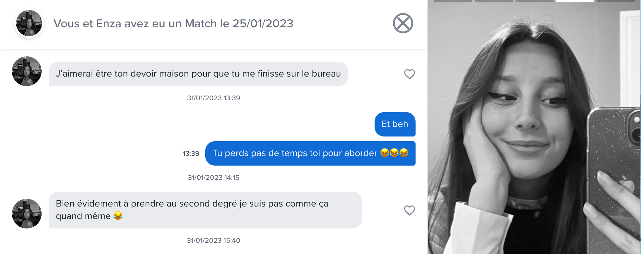 Le 04 fĂ©vrier 2023 Ă 12:16:18 :GG khey ca me rappel ma pĂ©riode Tinder Mathilde on sait ce quâelle veut Screen un peu des conv fais nous rĂȘver