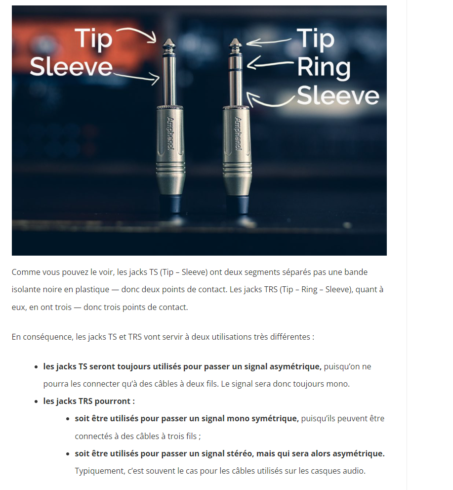 a gauche la connectique d'un cable jack TS (asymétrique ), ce que tu dois prendre pour une guitare , et a droite c'est un TRS (symétrique )![]()