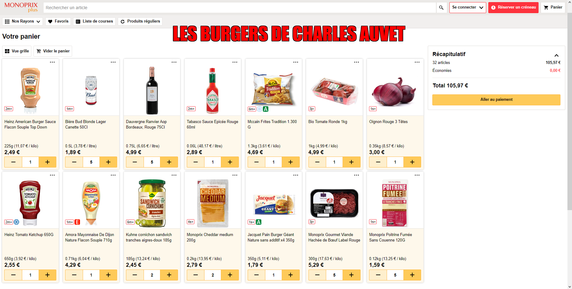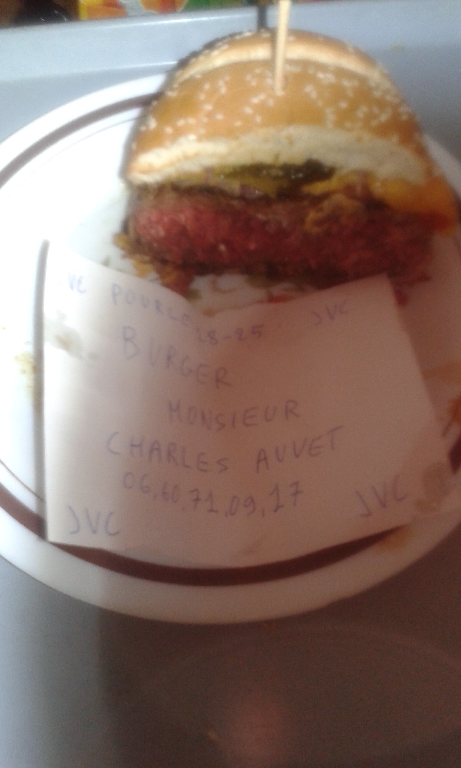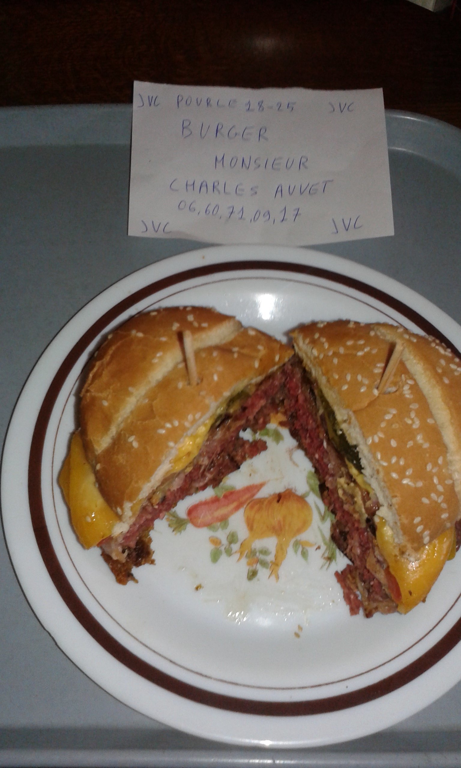 POUR 4 PERSONNES VOILAS COMMENT JE PREPARE MES STEAK HACHER LARDER POUR MES BURGERS CHARLES AUVET BURGER CHARLES AUVET 280 GR DE VIANDE BOEUF + 140 GR TRANCHE LARD FUMER ! 420 GR . DEUX TRANCHES DE CHEDDAR SUR LE STEAK HACHER LARDER CHARLES AUVET + 2 CORNICHONS + 2 OIGNONS ROUGE EN RONDELLE UNE RONDELLE DE TOMATE ! DEUX PAIN BURGER ASSEMBLER N OUBLIE PAS LE KETCHUP TABASCO OU LA SAUCE BURGER HEINZ POUR 4 PERSONNES 280 GRAMMES DE STEAK HACHER LIMOUSIN PAR PERSONNES LARDER AVEC 5 TRANCHES DE BACON CUISSON 3 MINS PAR FACE FEUX FORT TERMINER LA CUISSON DISPOSANT 2 TRANCHES DE CHEDDAR SUR LE STEAK CHARLES AUVET FEUX MOYEN EN COUVRANT A L AIDE COUVERCLE EN METAL OU VERRE SURTOUT LE PAIN TU LE TOAST SANS HUILE DANS LA POELE FEUX FORT PENDANT 2 MIN PAR FACE. MAIS SURVEILLE QUE CA CRAME PAS DES PAIN BURGER RESULTAT :