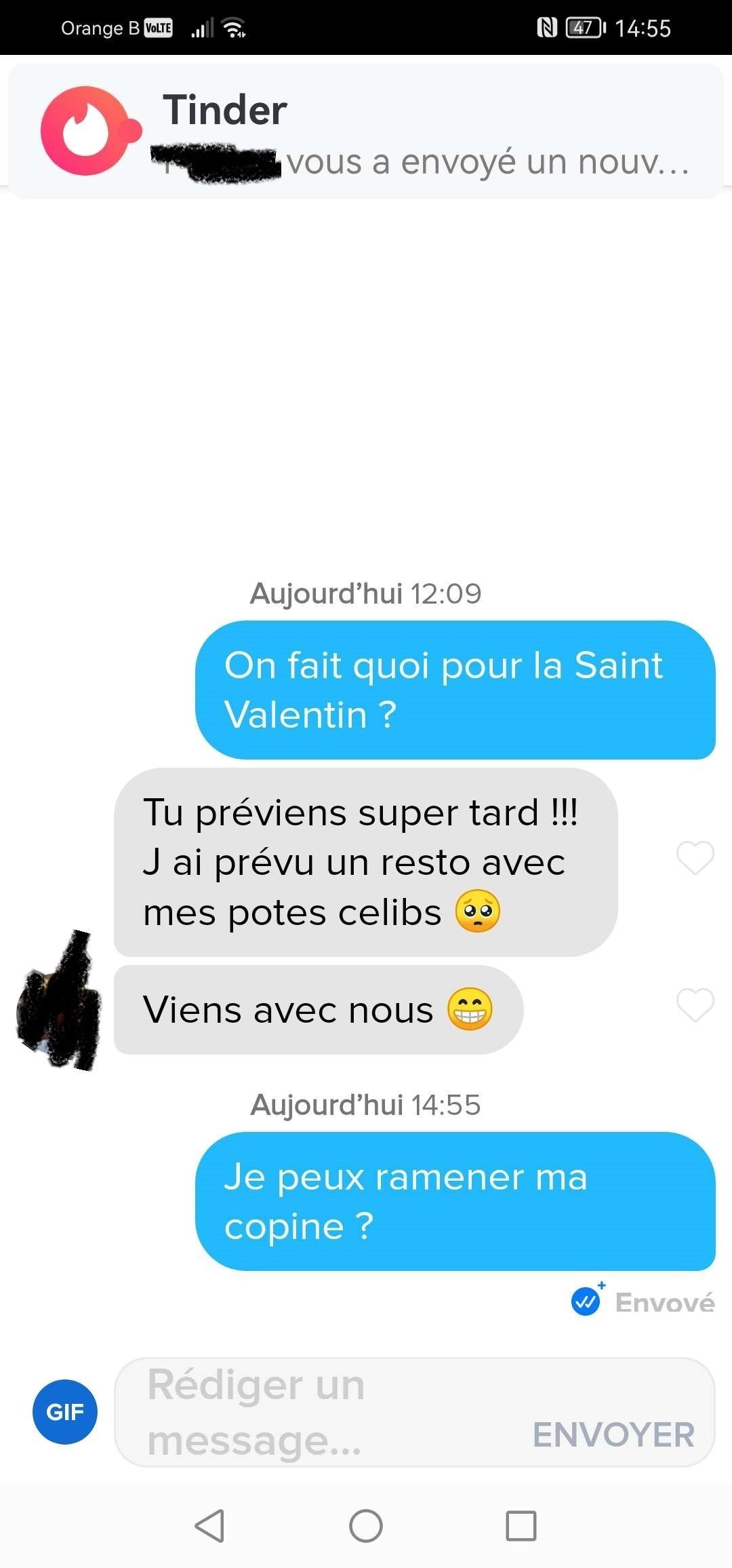 La première avec le mec qui ramène sa copine pendant un resto full célibs de meufs Tinder c'est très très drôle ahi