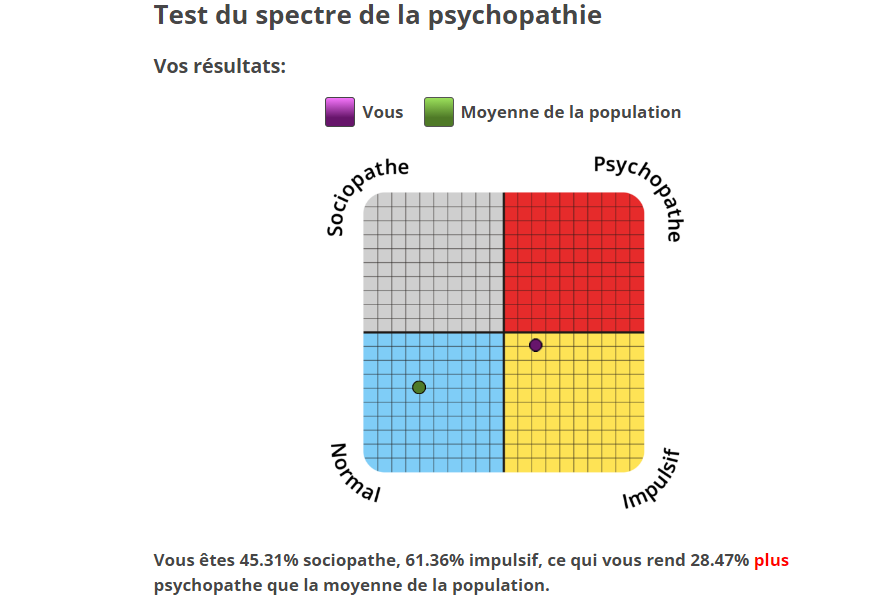 Perso : Vous êtes 48.44% sociopathe, 86.36% impulsif, ce qui vous rend 42.53% plus psychopathe que la moyenne de la population.