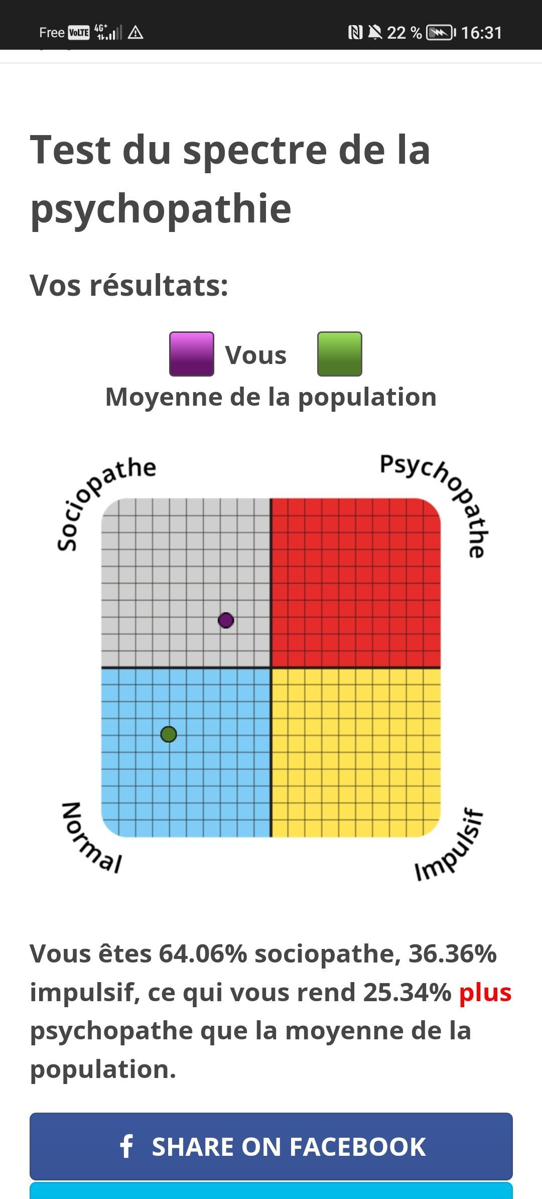 Vous êtes 64.06% sociopathe, 63.64% impulsif, ce qui vous rend 38.98% plus psychopathe que la moyenne de la population.
