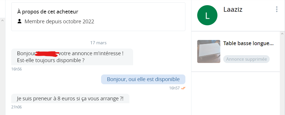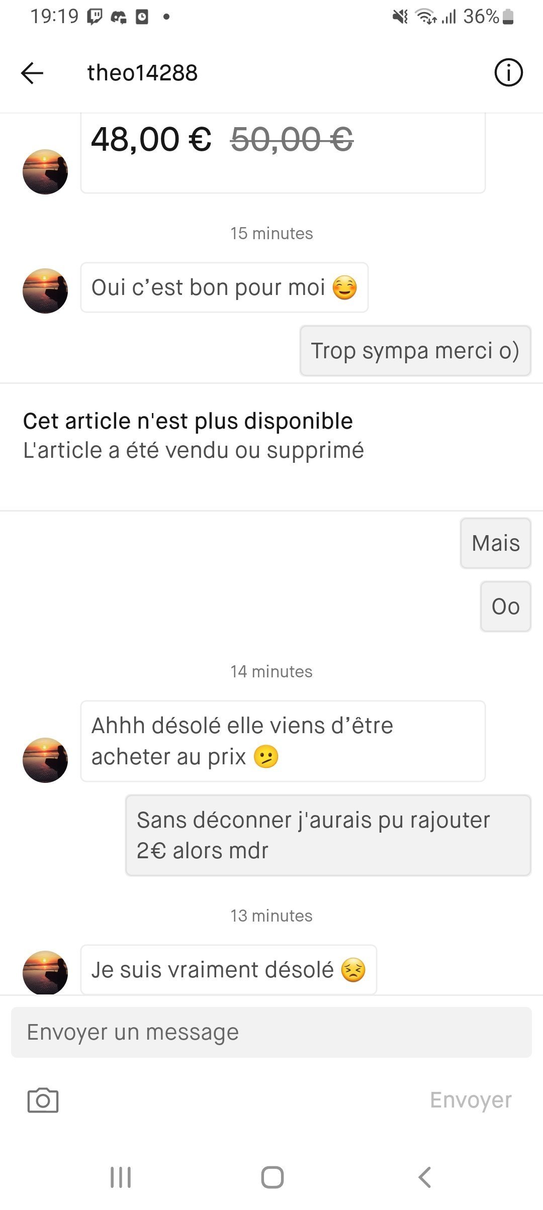 En gros ça accepte la négo' légère sur un produit qui côte à 130€ mini j'allais faire une superbe affaire, et au moment ou je go taper les codes de CB le produit se barre, vendu au prix de base, pas eu le temps de souffler. (Le profil du vendeur semble être honnête mais il demeure une sacrée, sacrée enflure , car je l'avais texté encore avant)