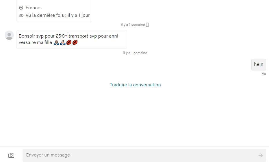 J'ai vendu un pc portable 120€ utilisé très rarement je l'avais acheté 200€ il avait même pas 1 ans je le vend a un daron et sur le lieu il commence à négocier le prix car j'avais oublié de ramener une la souris et dans mon annonce j'avais mis "souris offerte" j'ai quand même réussi à me démerder et lui vendre 120€ le lendemain il m'envoie un message "Oui bonjour ma fille n'en veut plus venez récupérer votre pc"