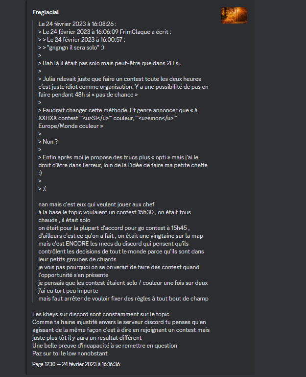 En fait je crois que le topic est plutôt unanime sur cette histoire d’orga des contest, en dehors de vous du Discord j’entends.