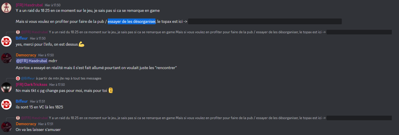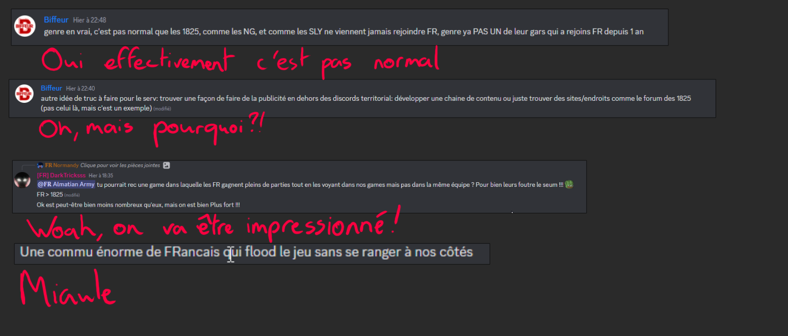 C'est ce qu'on leur a dit mais ils sont tellement arrogant de voir un autre groupe français débarquer, pourtant j'ai essayé de négocier avec eux mais ils veulent juste piquer des membres du forum pour leur clan bidesque