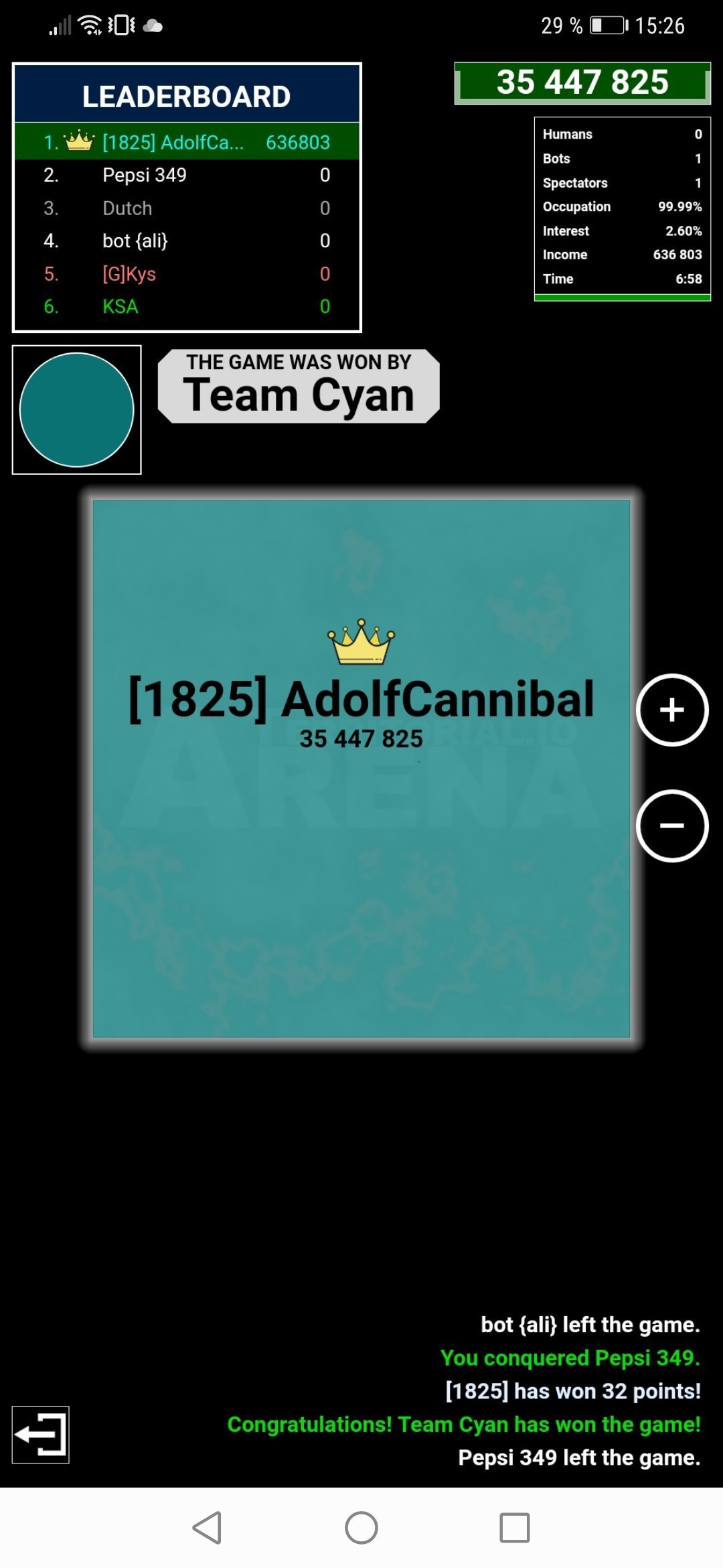 Tu aurais pu chopper un peu le territoire du jaune quand il avait 3M, mais au lieu de ça tu attaquais le rouge. Et quand on était à deux sur l'ennemie tu attaquais une fois toute les 30 secondes alors que tu pouvais attaquer plus de fois et après je t'aurais juste donné mes troupes