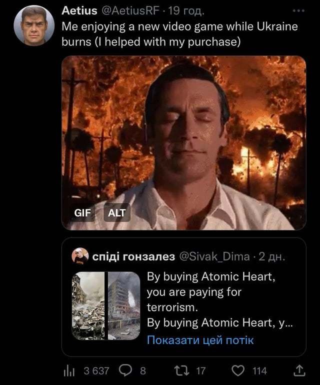 L'Ukraine veut faire interdire Atomic Heart et va envoyer une demande officielle à Sony, Microsoft et Valve pour retirer le jeu de leurs vitrines. Le pays souhaite que sa distribution soit limitée parce que le développeur du jeu, Mundfish, aurait des liens avec la société énergétique publique russe Gazprom. De plus, lorsqu'on lui a posé la question, le développeur n'a pas carrément dénoncé l'invasion de l'Ukraine, ce qui laisse penser que Mundfish la soutient ou est ambivalent à son sujet, ce qui veut-dire qu'un jeu Atomic Heart acheté = Un orphelinat ukrainien détruit.![]()