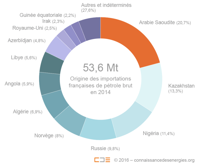 Des quelques pays sub-sahariens auxquels nous achetons une petite part de notre consommation en hydrocarbures (Angola, Guinée Equatoriale, Nigéria) aucun n'a jamais été colonisé par la France ni n'est associé au mythe de la Françafrique. L'écrasante majorité du pétrole et du gaz importés en France provient de pays comme l'Arabie Saoudite, le Kazakhstan, la Russie ou encore la Norvège (cette dernière représente à elle seule 39% de nos importations de gaz en 2015).![]()