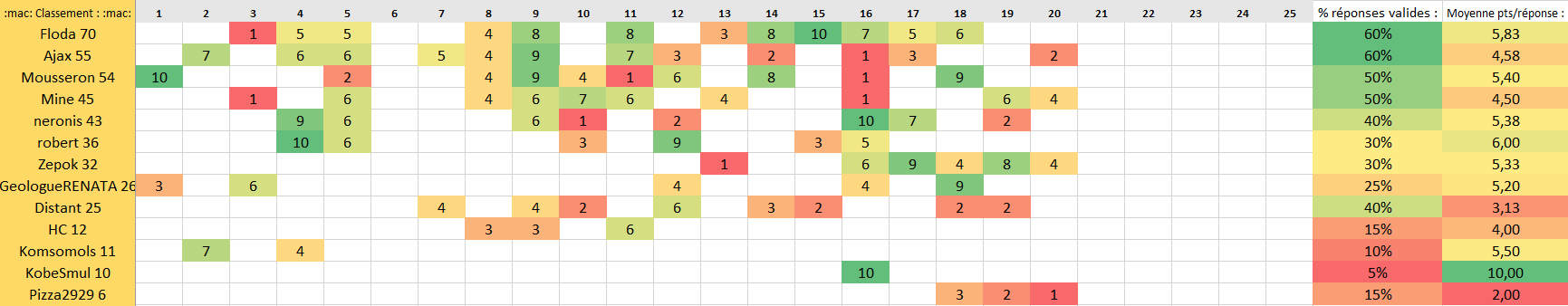 Le script est réparé, voilà donc les points sur chaque question, ainsi que les statistiques :![]()
