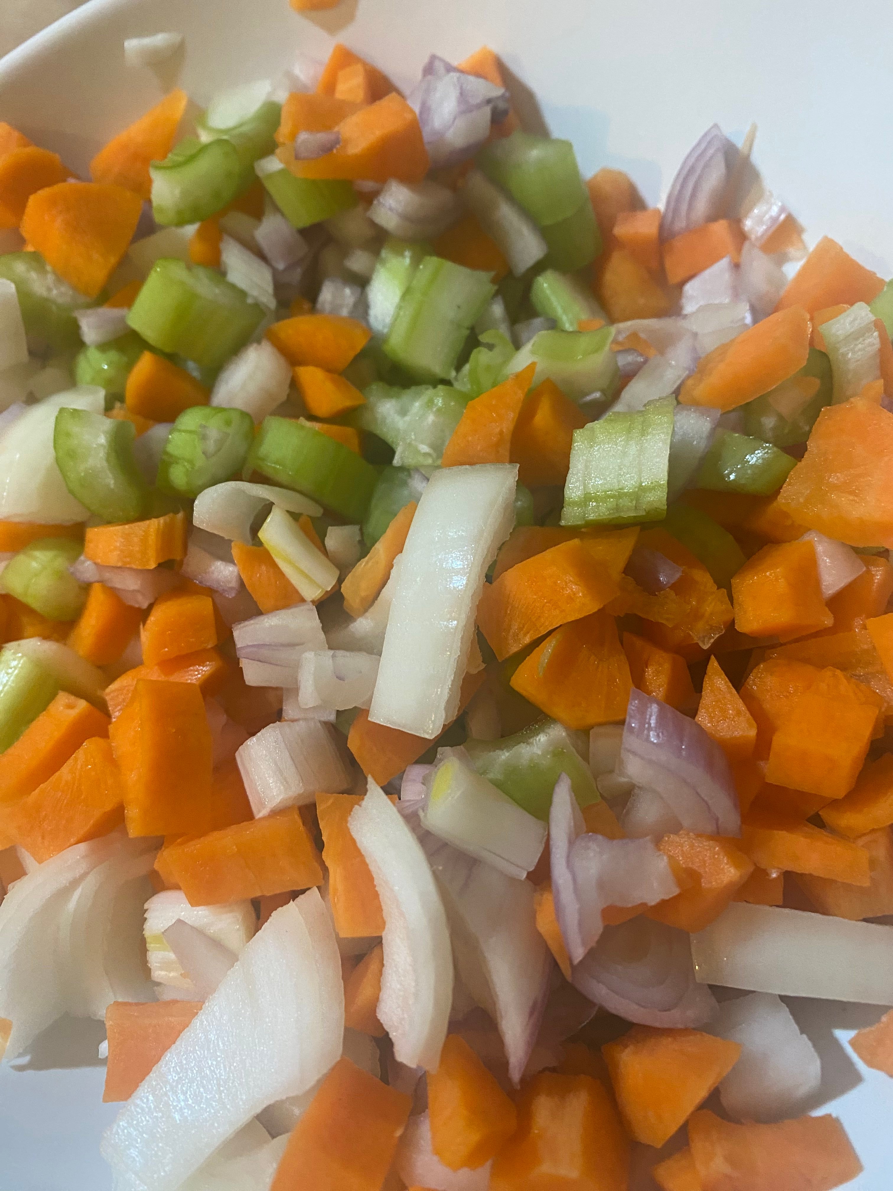 Peler et émincer l’oignon/les échalotes, éplucher et couper en dès les carottes, rincer le céleri, l’effilocher et le couper en dés également. Ajouter le tout dans un saladier, réserver pour plus tard.