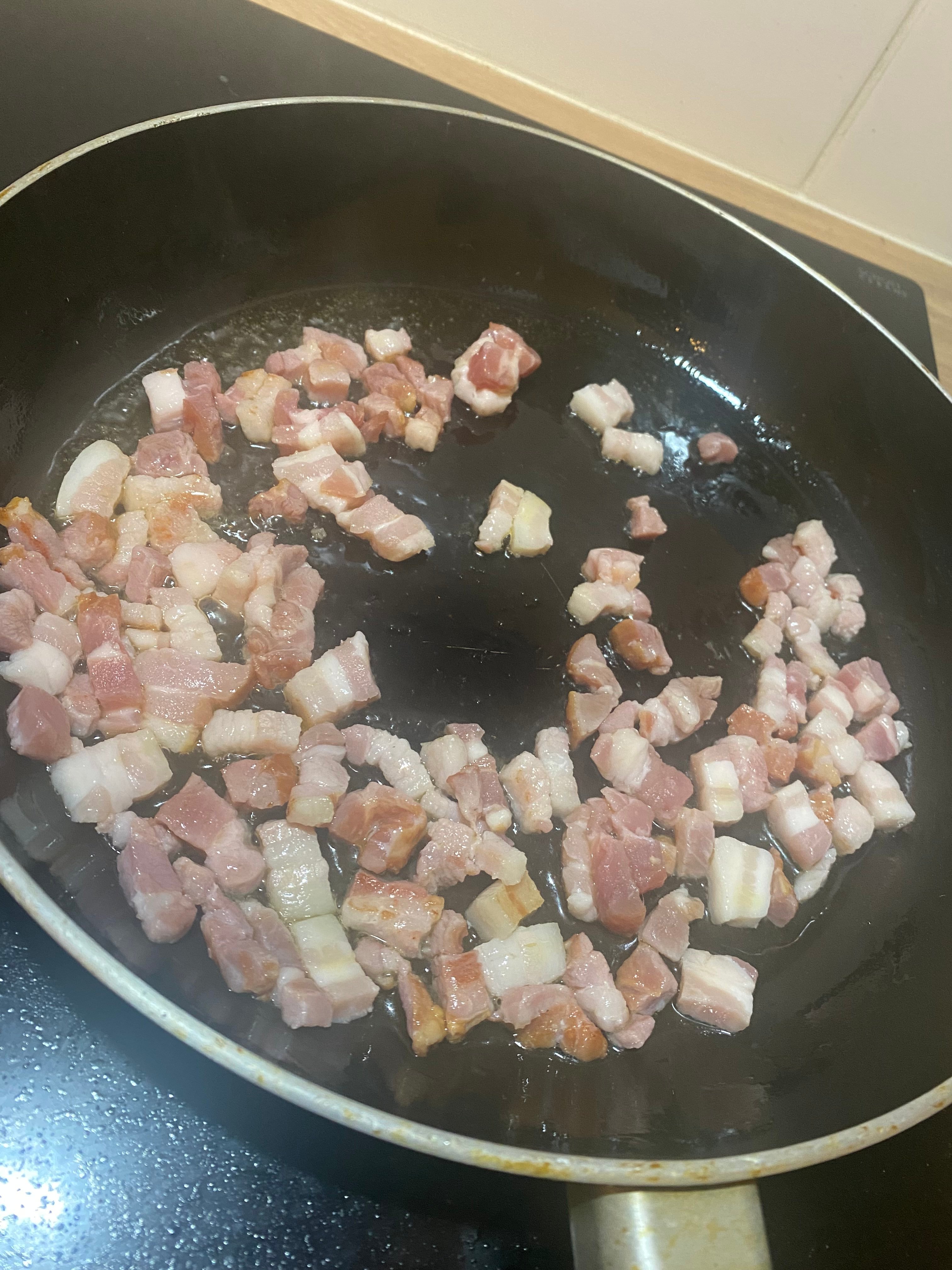 Préparer la pancetta en la tranchant en petits lardons, la mettre à saisir à feu puissant dans une sauteuse, ou un faitout de meme dimension, ou à défaut comme moi facon clodo avec une poêle et du film plastique pour couvrir faute d’avoir un couvercle (