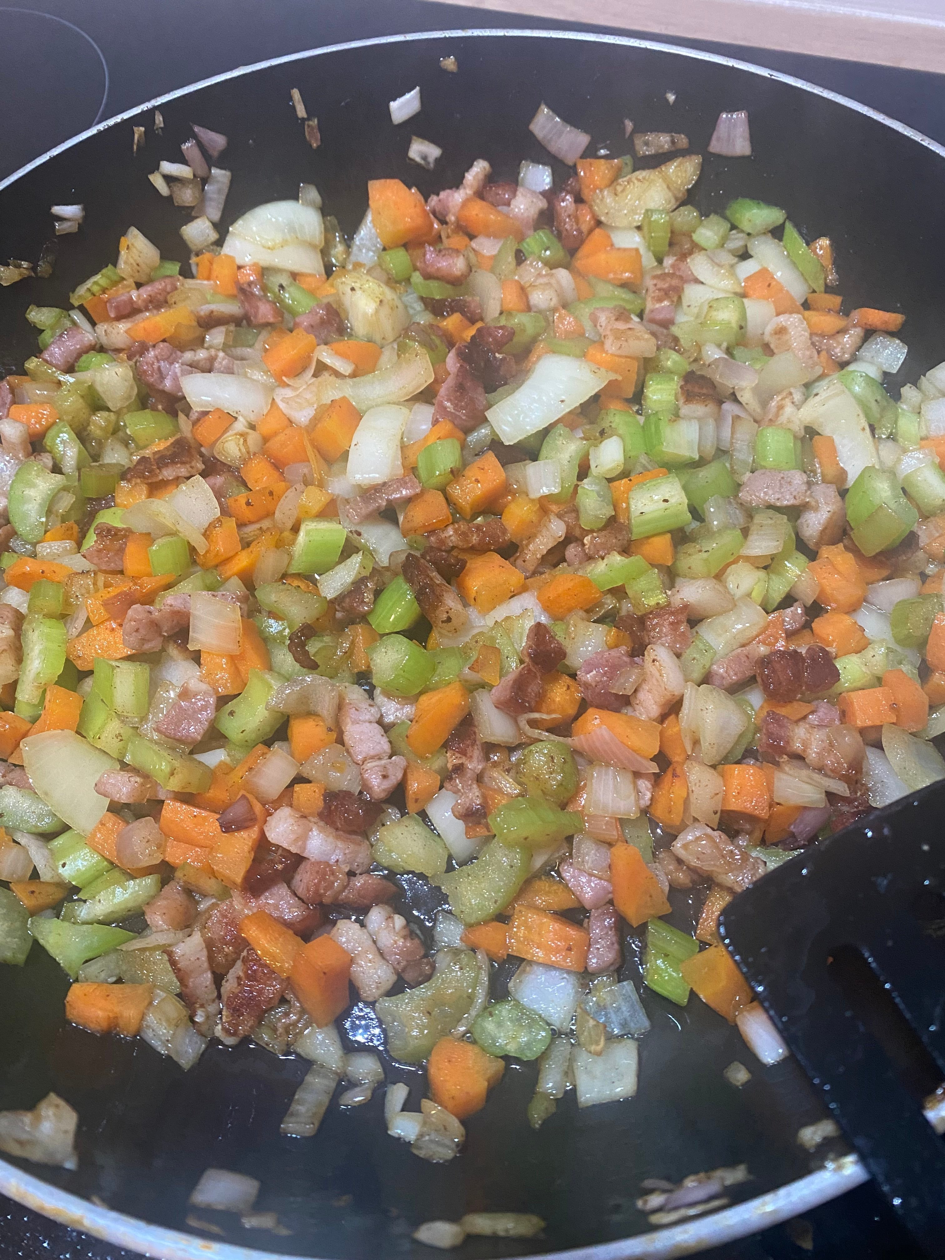 Lorsque la pancetta est saisie, ajouter le mélange de légumes. Les saisir à feu puissant, puis laisser cuire à feu doux quelques minutes jusqu’à ce que les légumes blondissent.