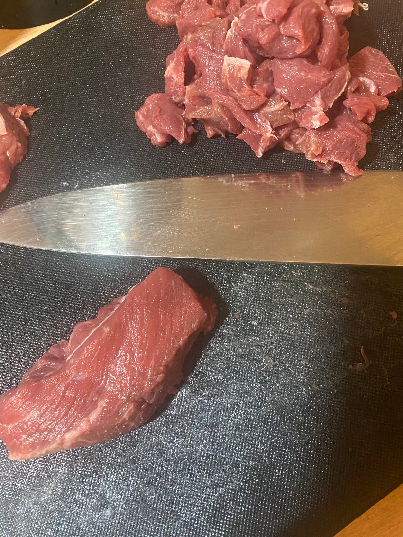 Pendant ce temps, émietter la chair à saucisse et la réserver. Hacher ou émincer très finement en touts petits morceaux le paleron de bœuf (personnellement j’aime que ce soit émincé en petits morceaux plutôt que haché, mais c’est à convenance, si vous n’avez pas de hachoir à viande, pensez à acheter du bœuf déjà haché, mais demandez au boucher du paleron haché, évitez d’acheter de la viande hachée au rayon ou pire des hachés surgelés, ce ne sont pas de bons morceaux de viandes ce sont des déchets raclés sur les os et beaucoup de gras).