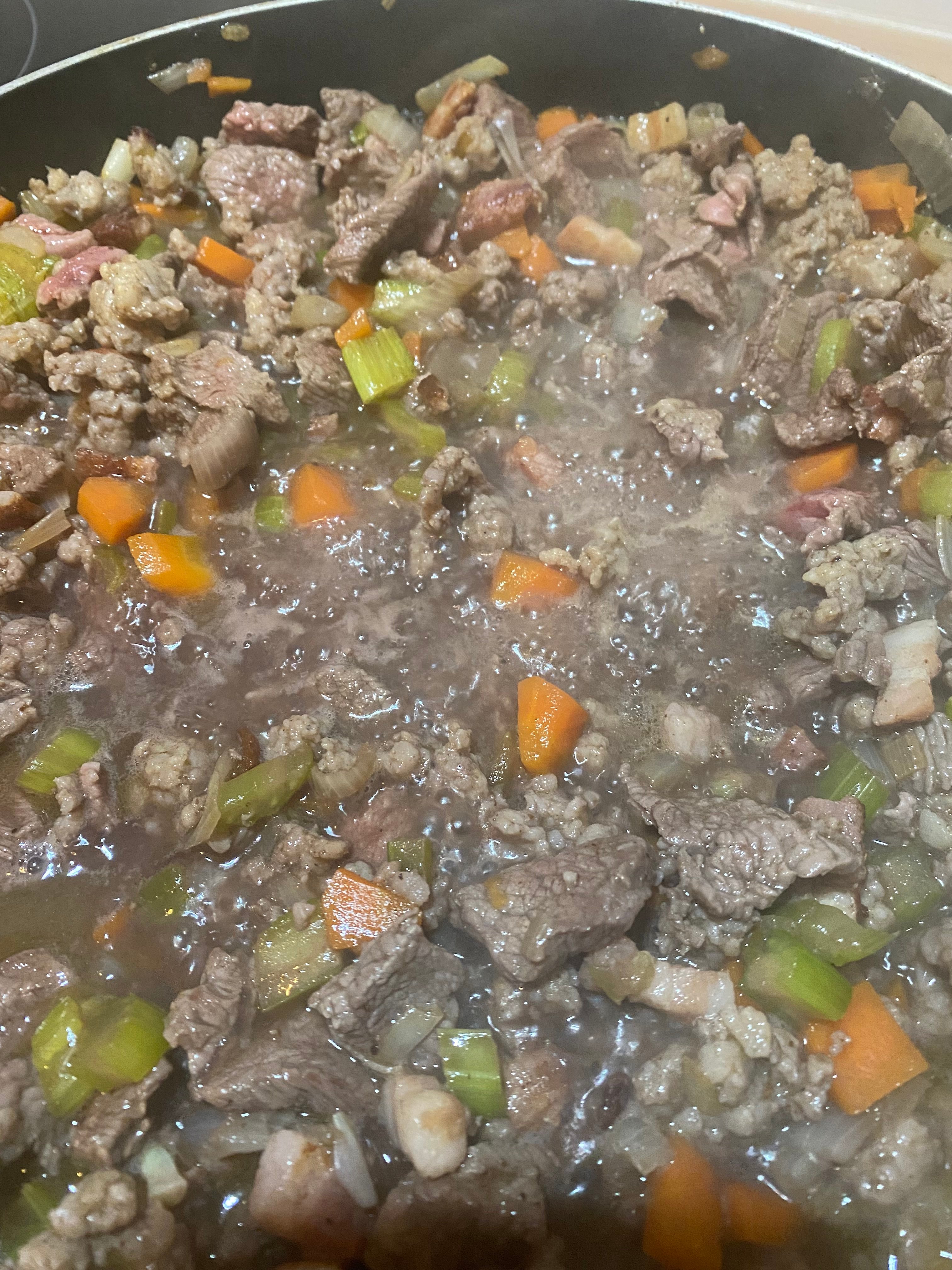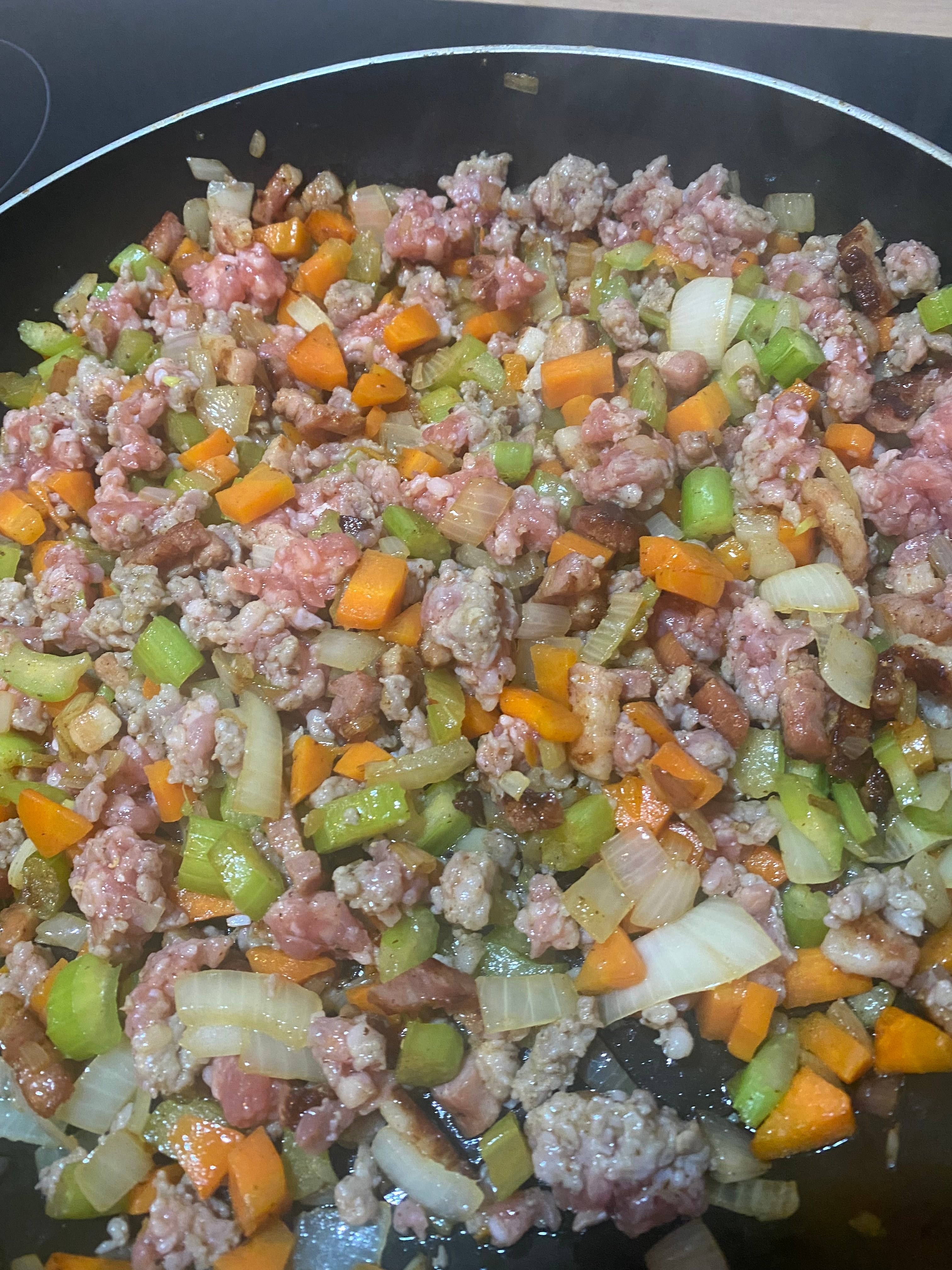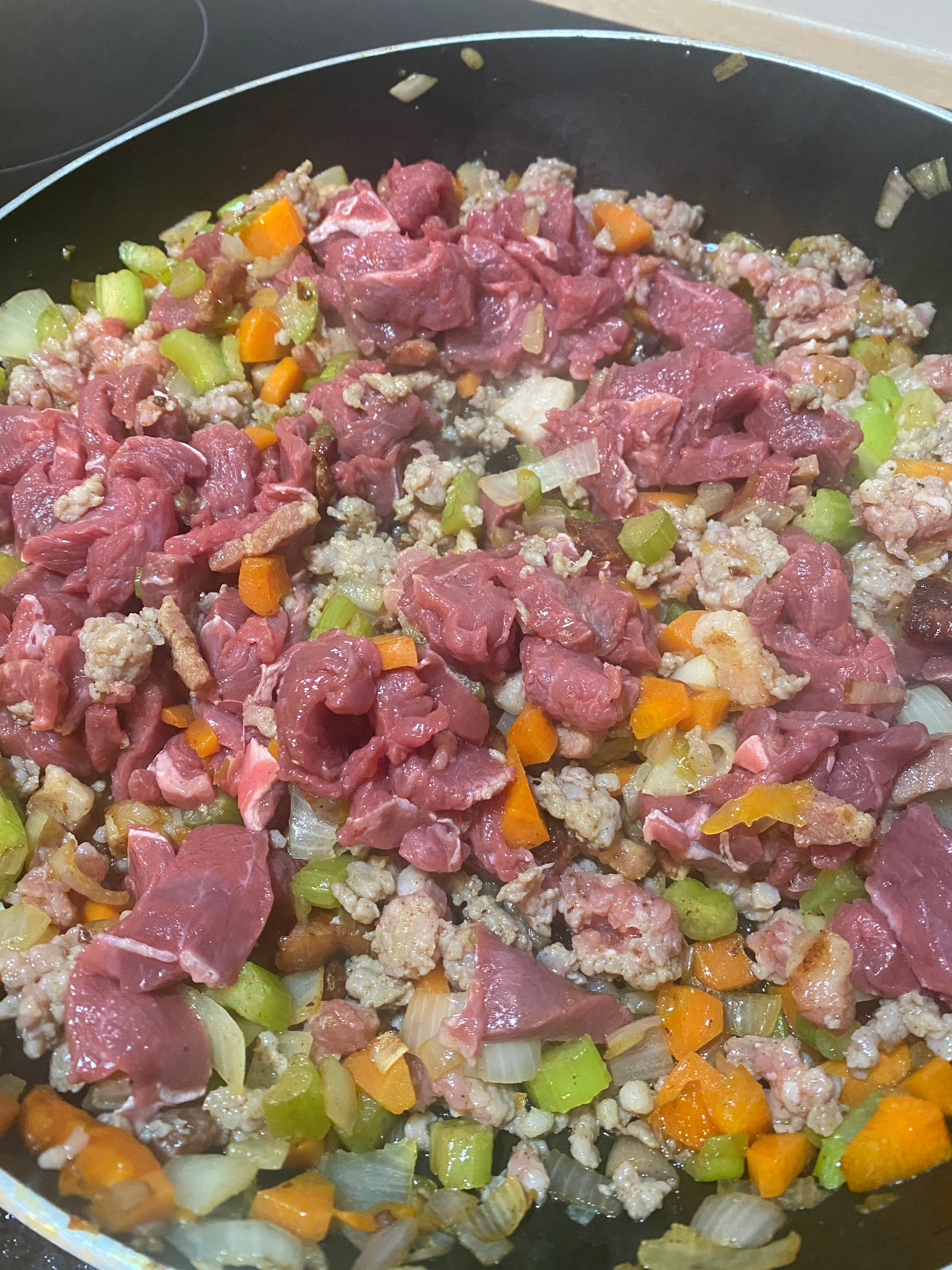Lorsque les légumes ont blondis, ajouter la chair à saucisse, la saisir à feu puissant, puis ajouter immédiat le paleron de bœuf, le saisir également.