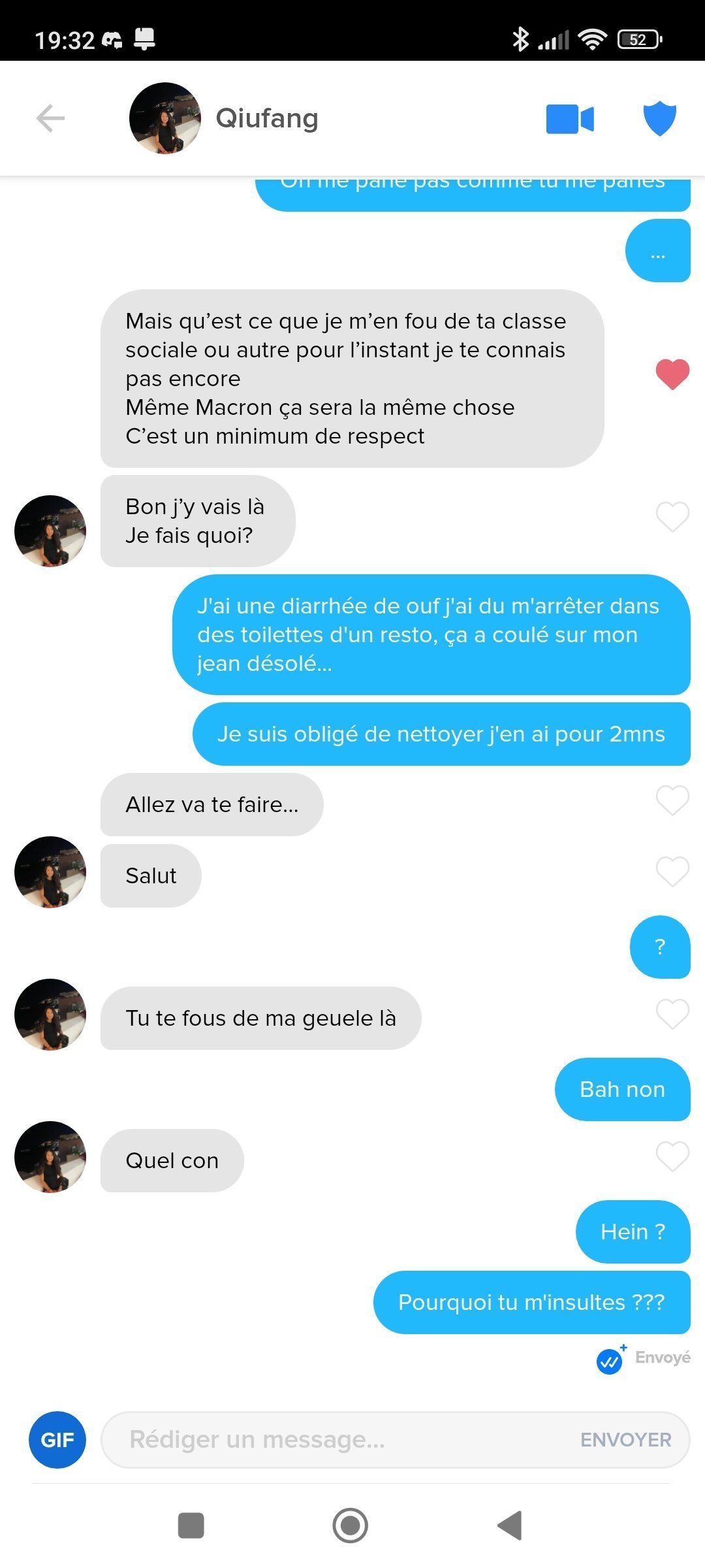 Le 03 mars 2023 à 11:59:42 :Le 03 mars 2023 à 11:58:50 :Cool ta vie "jus de fion"C'est bien de troll sur Tinder mais baiser t'arrive à le faire ça ?!