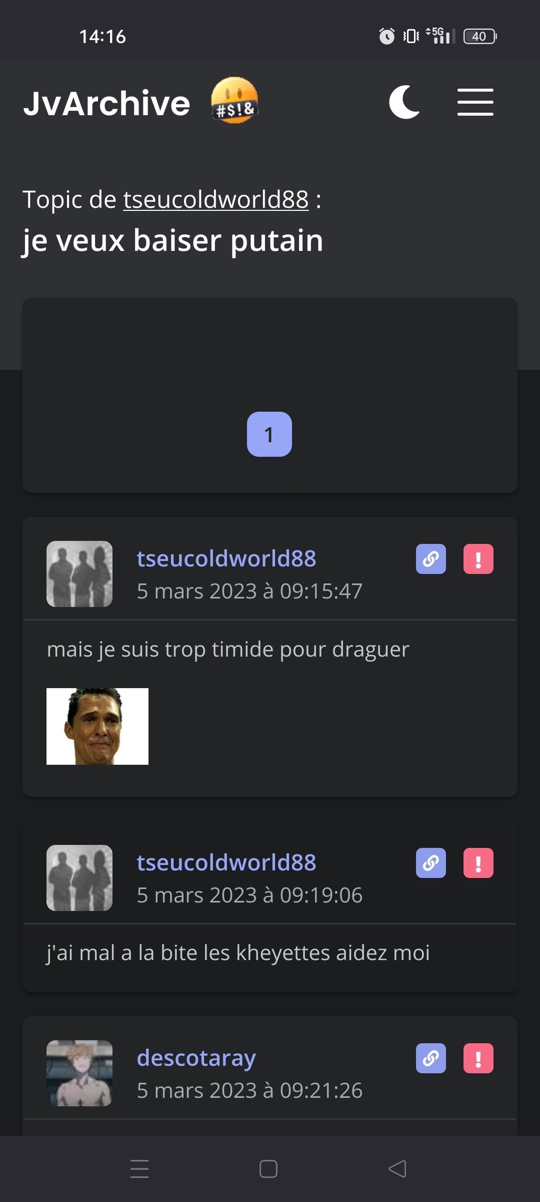 Ah j'avais pas vu son pseudo, visiblement ça n'a pas l'air de le déranger d'enfreindre les règles du coran, la sodomie est strictement interdite dans votre religion.