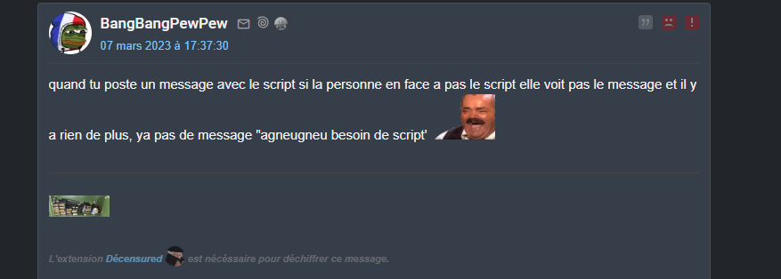 Il marche très bien c'est juste que le mec qui gère le script à fait que quand un message est posté avec le script interdit, ça affiche un message aux utilisateurs de deboucled (autorisé) pour dire que il faut le script interdit pour voir le vrai message. Du coup ça ruine totalement l'utilité du script interdit et les mecs l'utilisant sont directement grillé