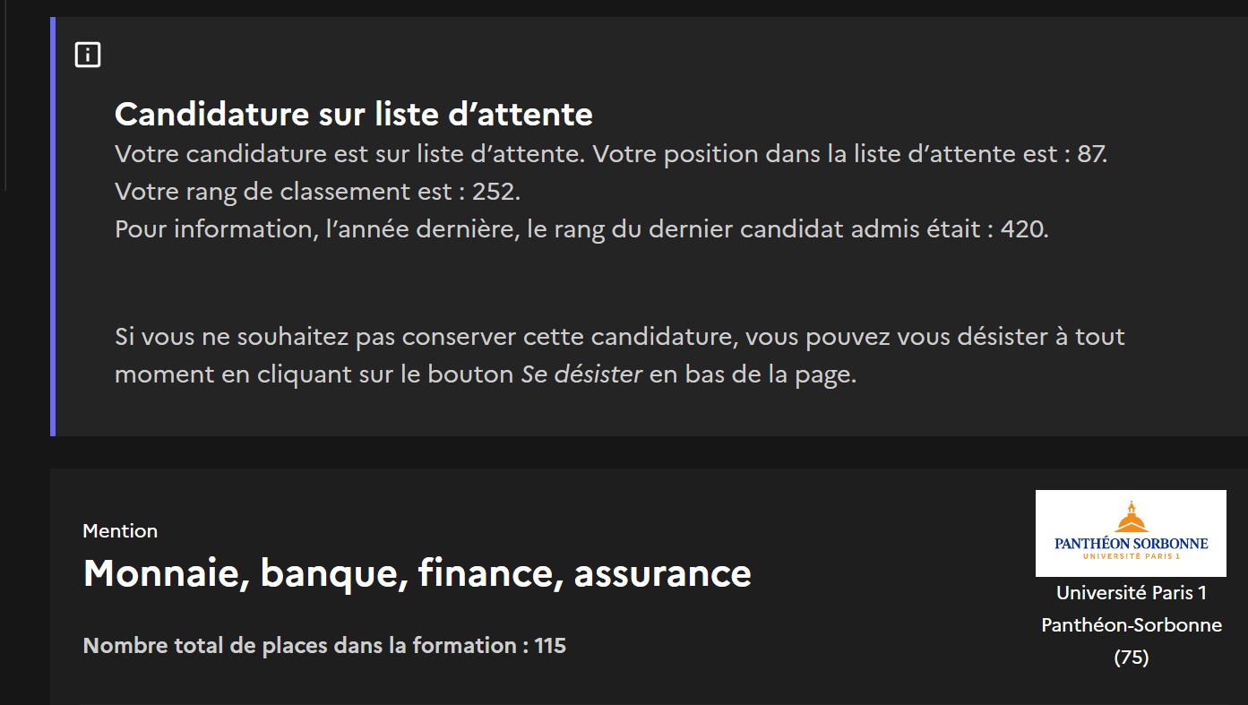 Par contre la vache 115 places mdrr perso dans le master où je suis actuellement c’était 25 places max et au final on est 13 (dont 1 redoublante) même si il restait de la place ils ont refusé les autres car ils ne voulaient pas prendre par « dépit » plusieurs personnes qui correspondaient pas à leurs critères