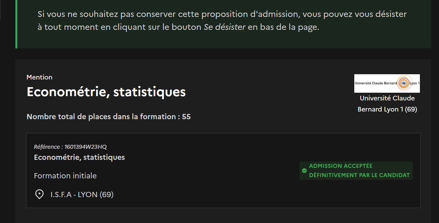 Admis ce matin dans le Master que je visais en priorité à Panthéon Sorbonne alors que mon dossier à rien à voir avec le Master en question et que mes notes sont exécrables ces trois dernières années, mais le nom de l'école d'ingé sur mes relevés de notes à sauvé mon dossier visiblement